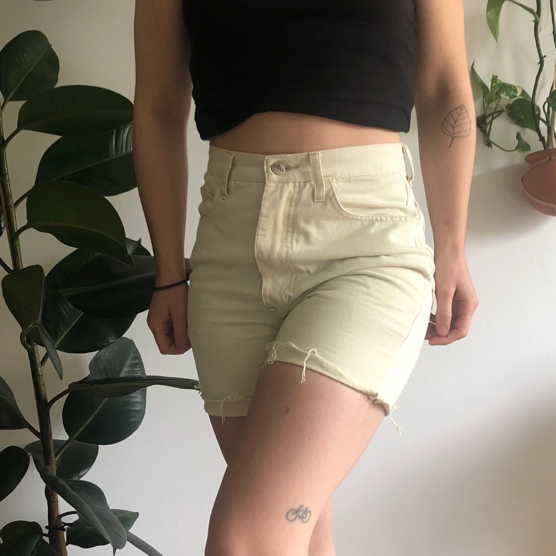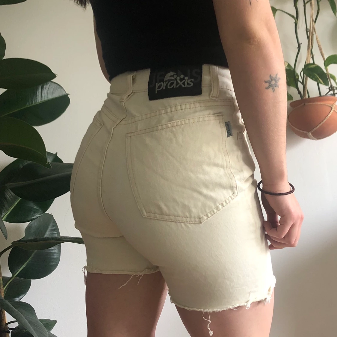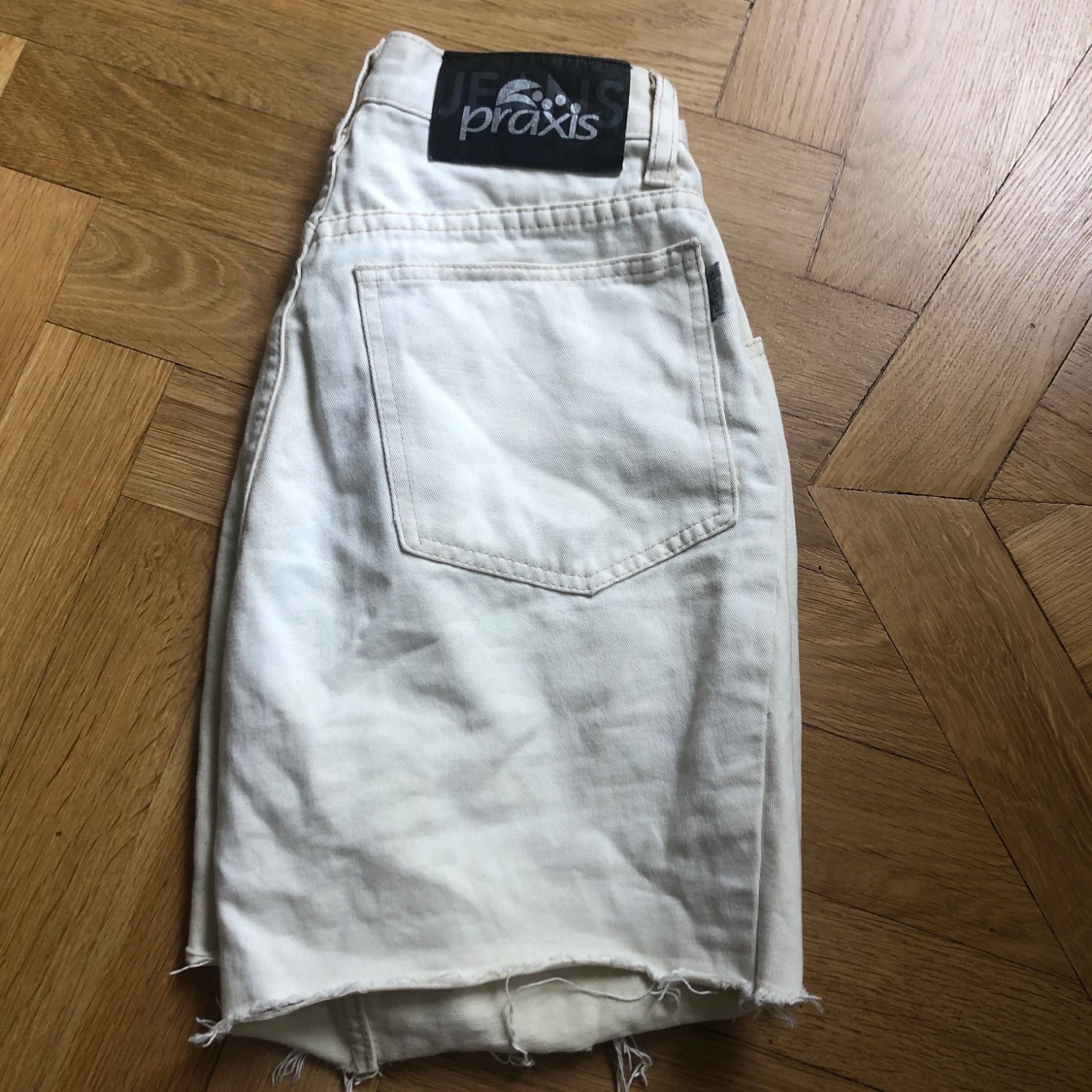 Cremevita avklippta shorts från märket praxis. Storlek S, midjemått 72cm
