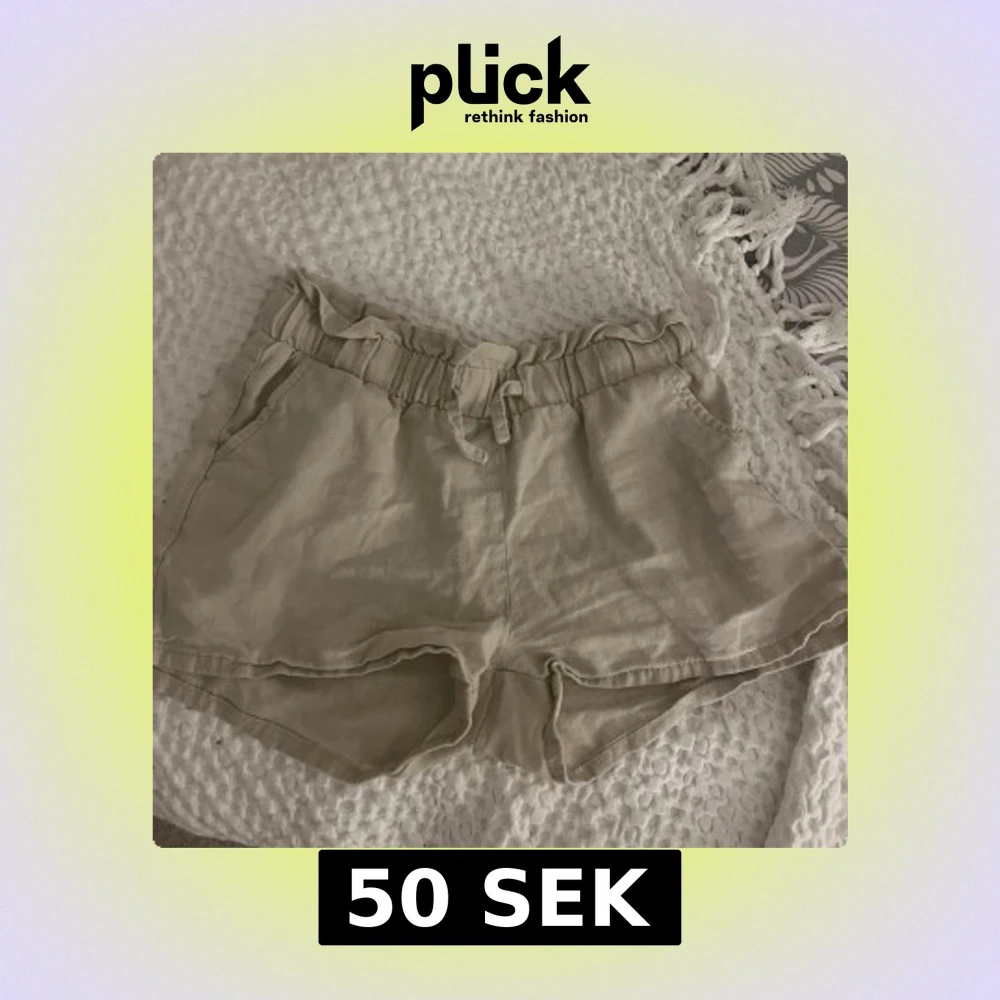 Säljer ett par beiga shorts i linne med knytband framtill. Shortsen har två sidofickor och en avslappnad passform, perfekta för varma dagar.