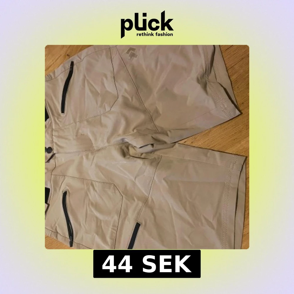 Säljer ett par beiga shorts från Black Diamond i storlek small. De har flera praktiska fickor med dragkedja framtill och ficklock bak. Materialet är lätt och syntetiskt, perfekt för aktiva dagar. Justerbar midja med kardborre för bästa passform.