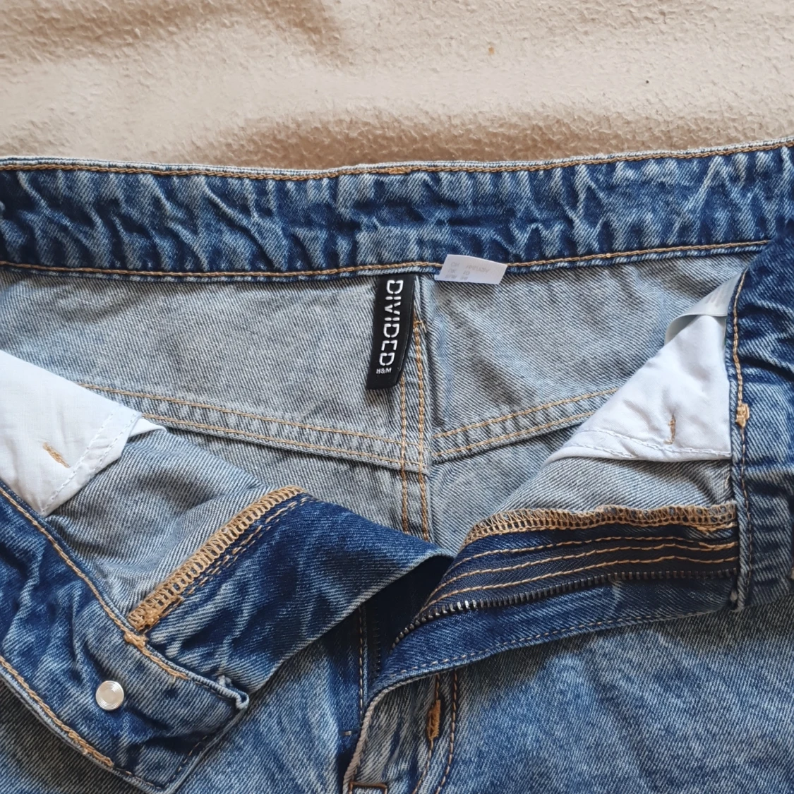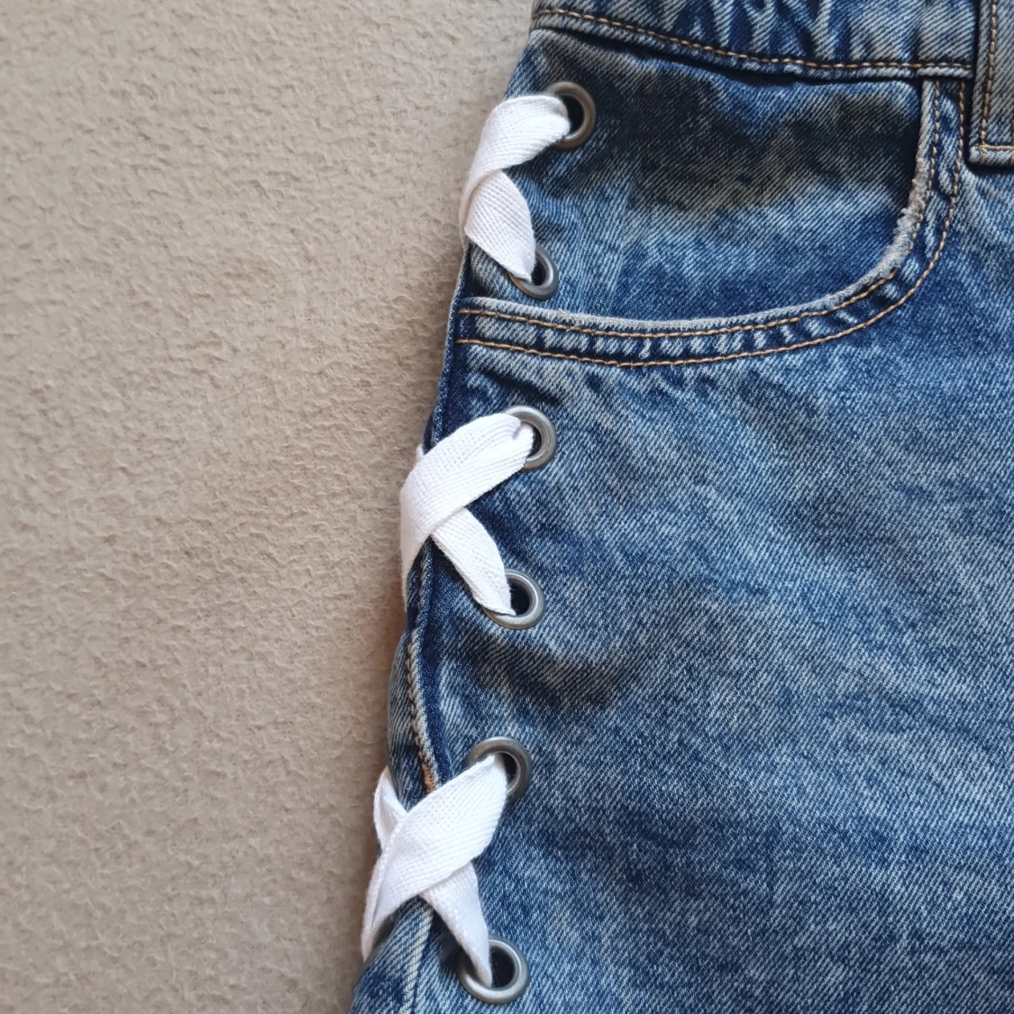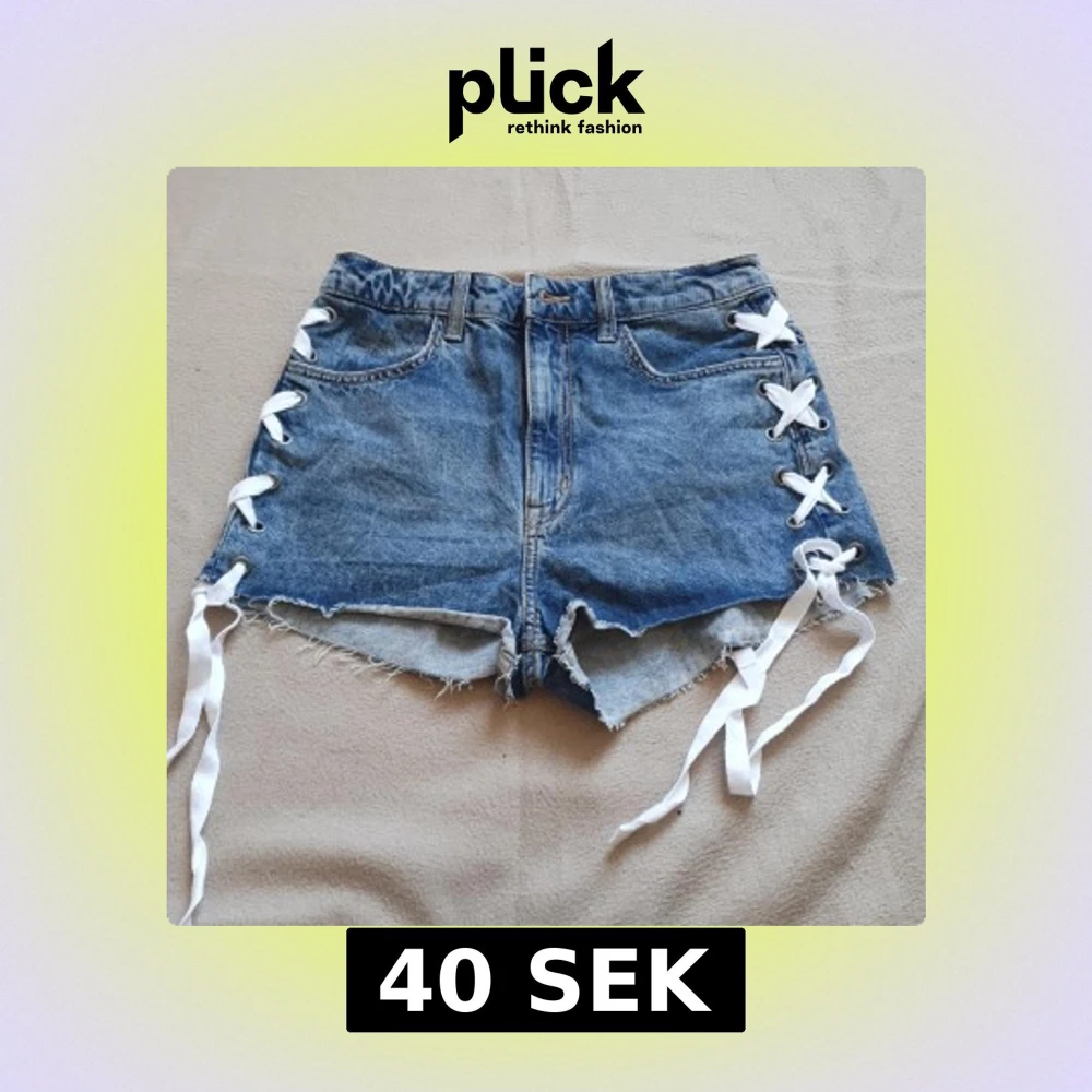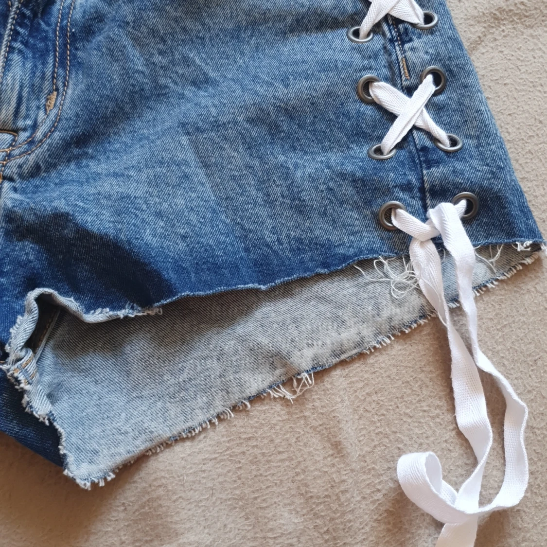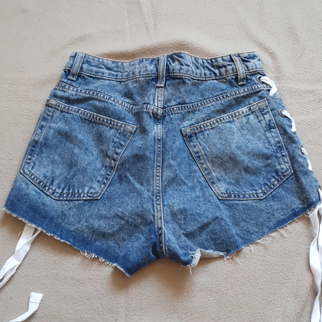 Snygga blå jeansshorts från Divided med cool snörning på sidorna och fransiga kanter. Perfekta för en avslappnad sommarlook. De har en klassiska fickor och dragkedja och knapp. Använd 1 gång o har annars endast legat i låda. Skulle säga att de har medel till hög midja.