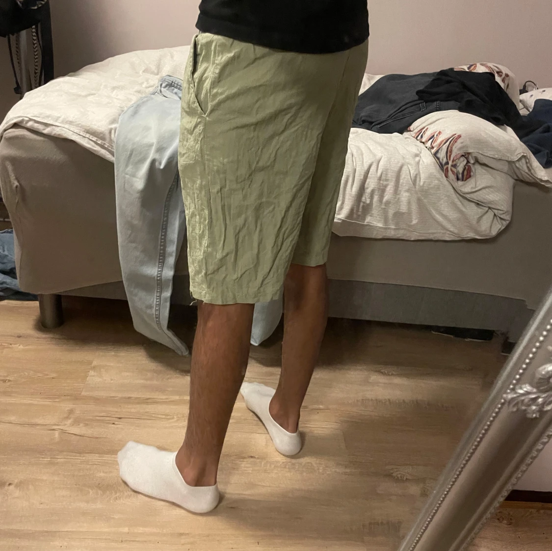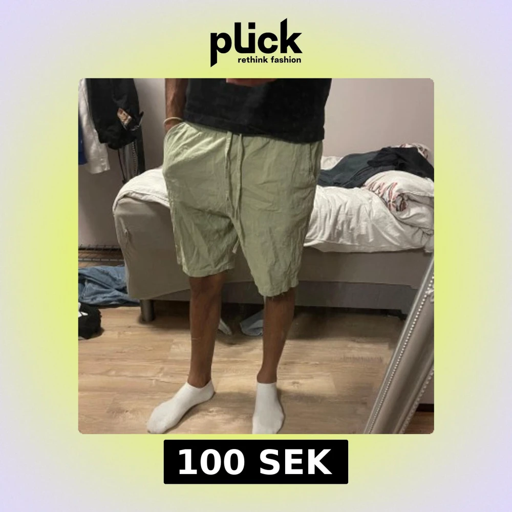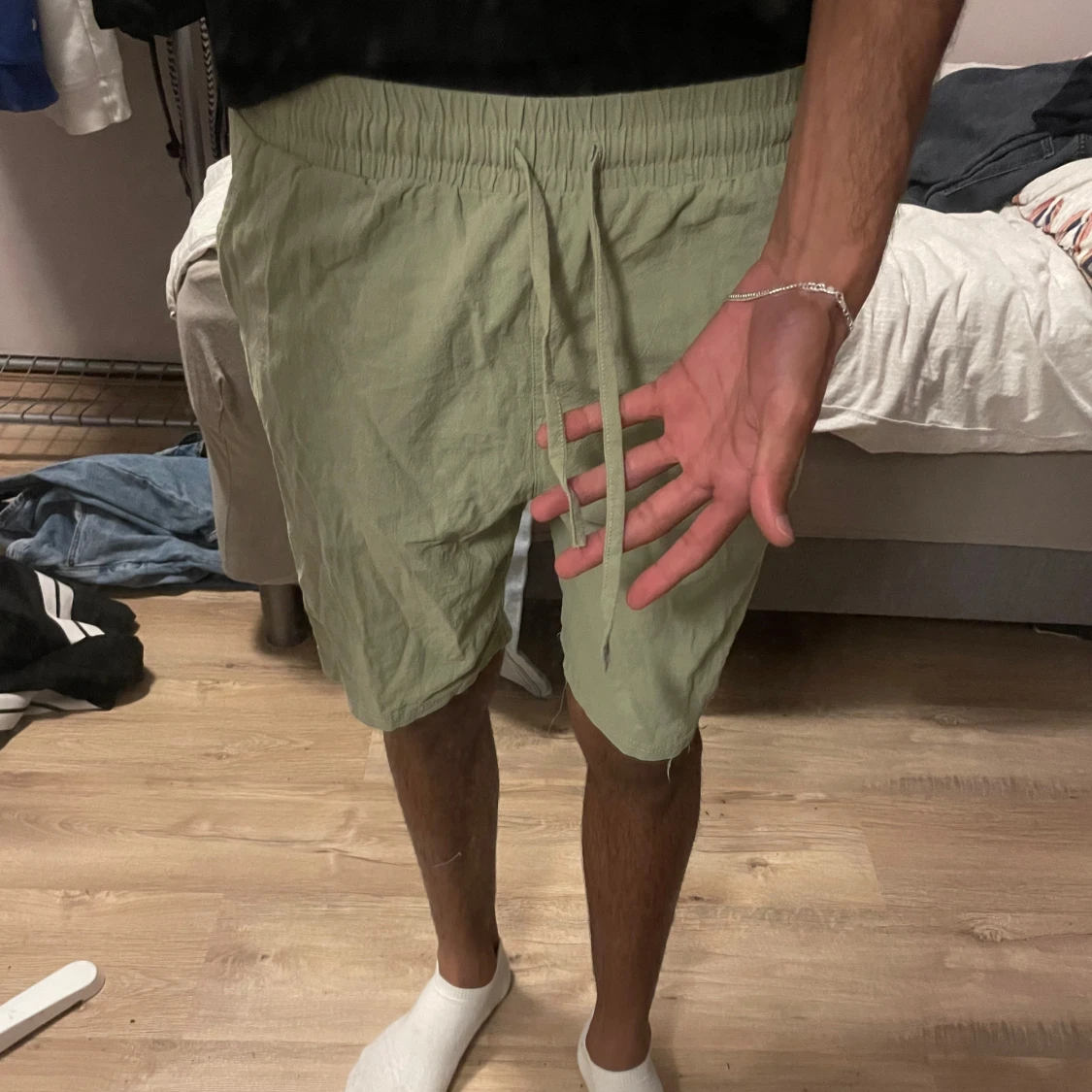 Säljer ett par ljusgröna shorts med avslappnad passform och elastisk midja med snörning. Materialet är lätt och ser ut att vara bomull, perfekt för varma dagar. Shortsen har fickor på sidorna och en enkel, clean look.