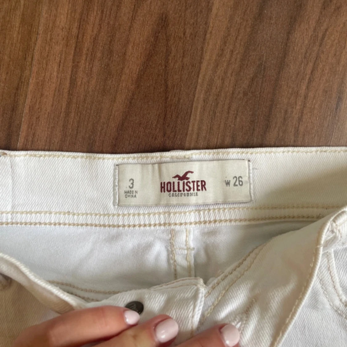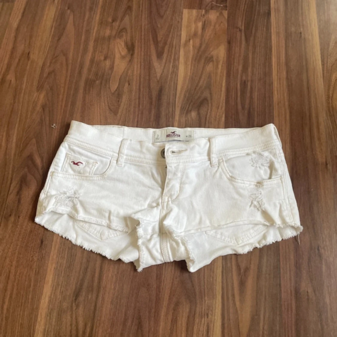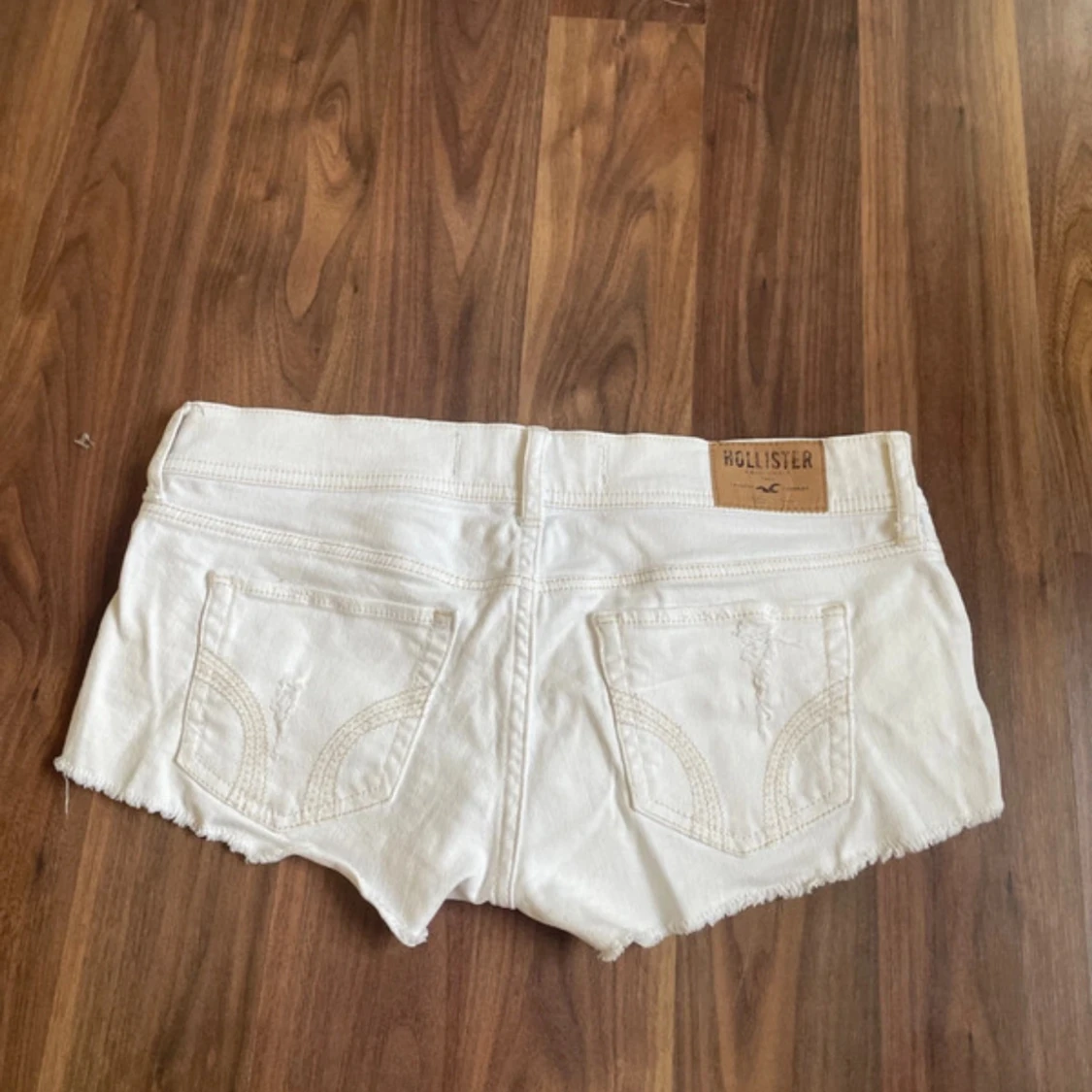 Säljer ett par vita, lågmidjade jeansshorts från Hollister i storlek W26. Dom säljs inte längre och är väldigt eftertraktade! Priset går att diskuteras💓