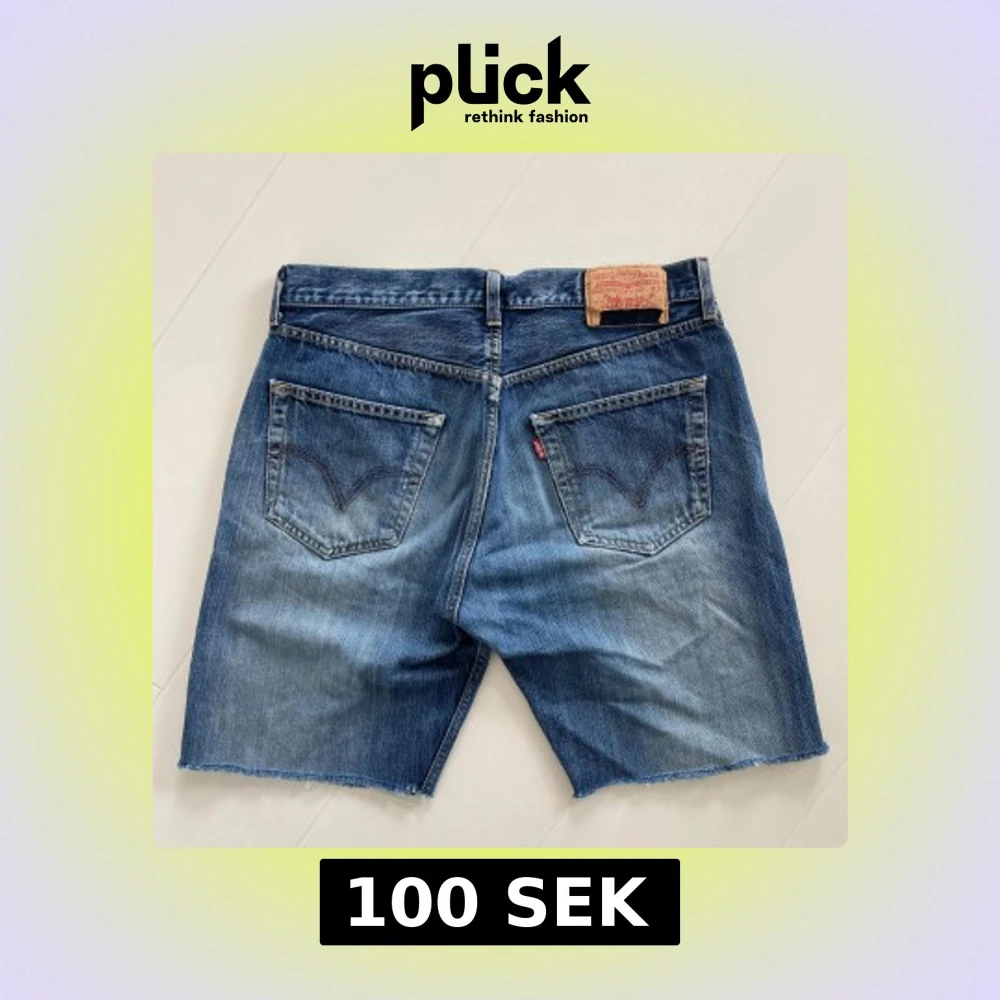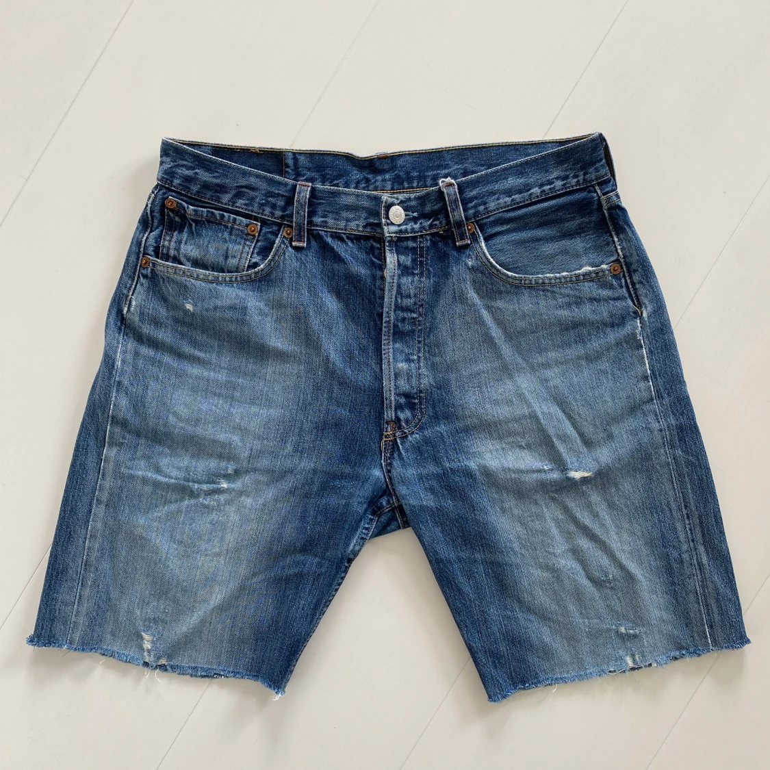 Klassiska blå jeansshorts från Levi's med fem fickor, råa kanter och knappgylf. Shortsen har en normal passform och tydliga slitningar för en avslappnad look. Perfekta för varma dagar och enkel stil. Mindja 42cm, längd 23cm innerlår