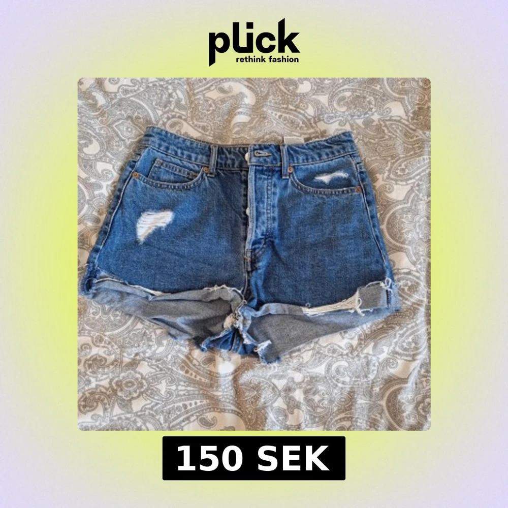 Säljer ett par blå jeansshorts från H&M i storlek 38. De har hög midja, klassiska fem fickor och coola slitningar framtill och baktill. Rå kant nedtill ger en avslappnad vibe. Perfekta för varma dagar och festivalhäng.