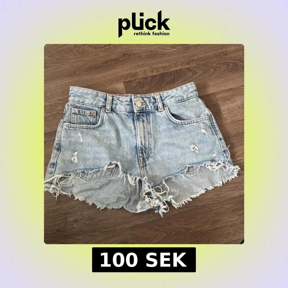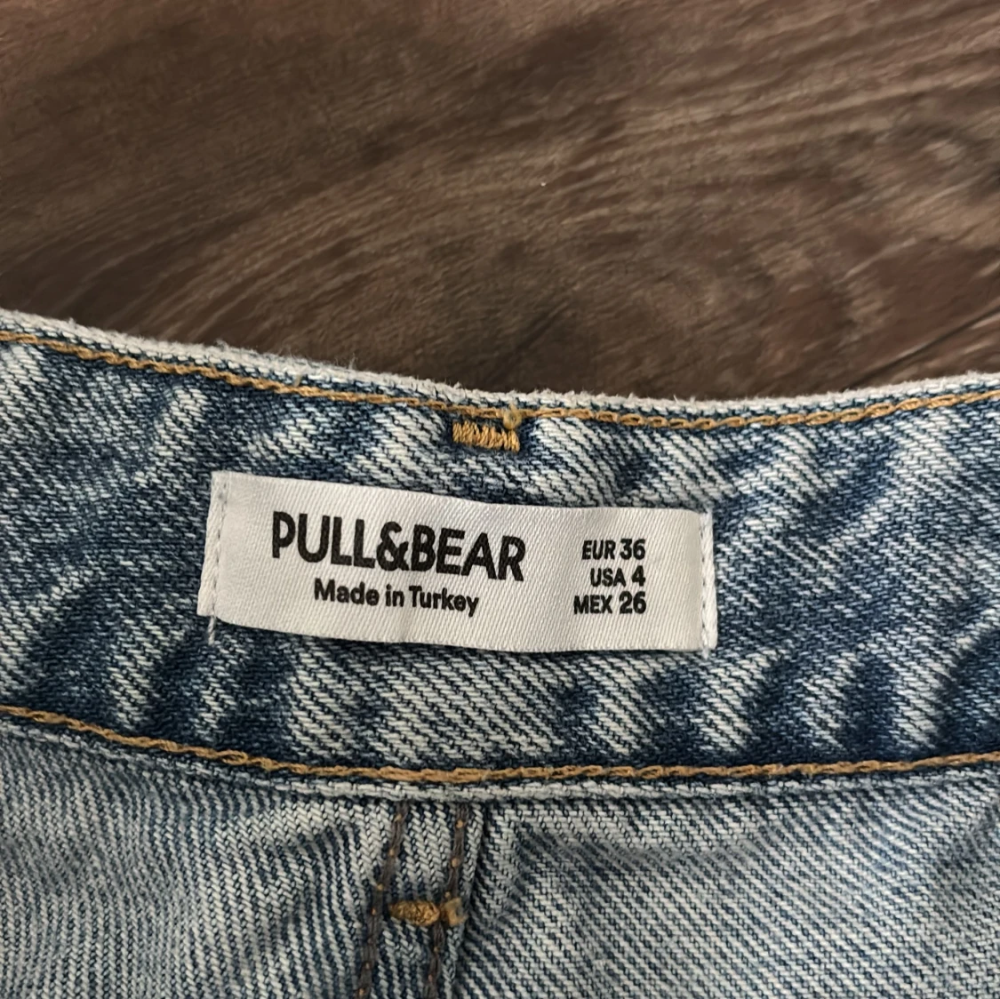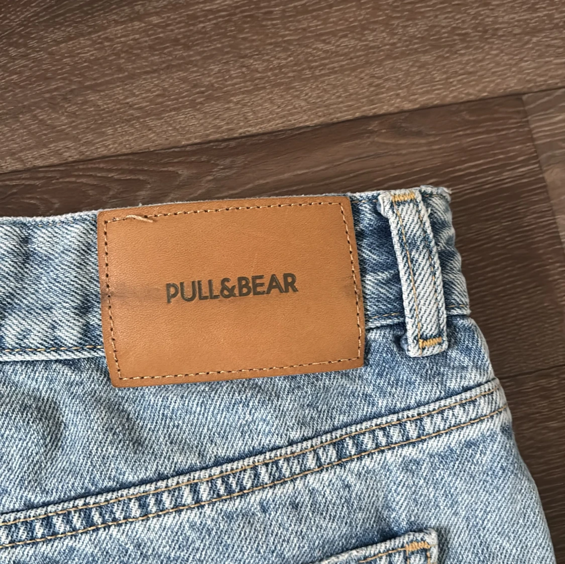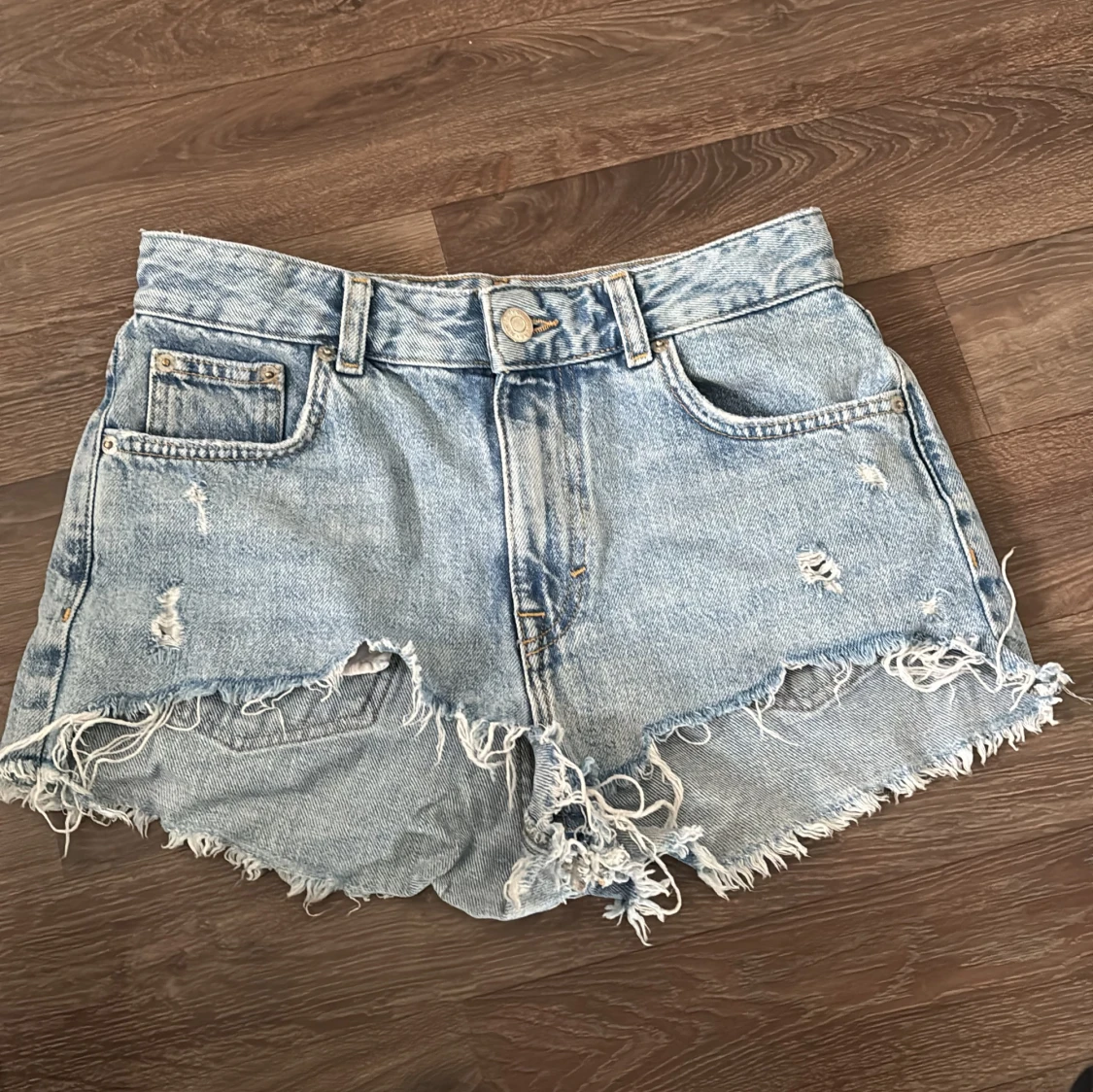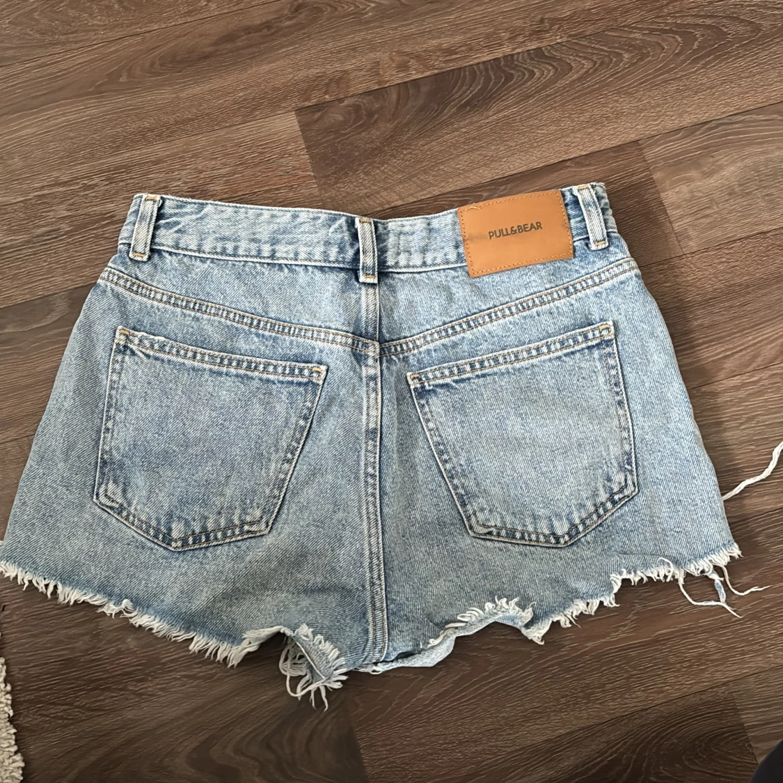 Säljer ett par ljusblå jeansshorts från Pull&Bear i storlek 36. Medel höga i midjan med råa och fransiga kanter samt slitna detaljer på framsidan. Perferka till sommaren💕
