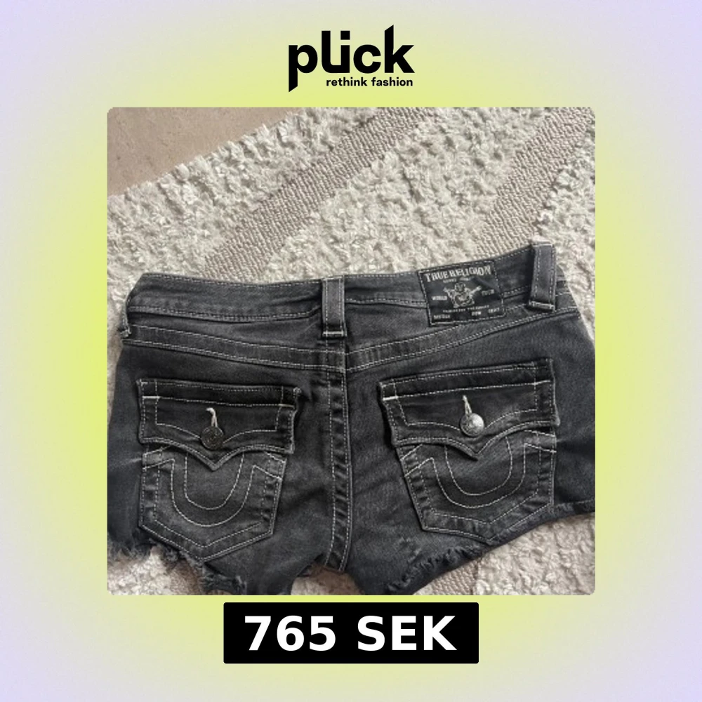 Snygga svarta jeansshorts från True Religion, modell Joey Cut-Off. Låg midja och är i storlek 26.