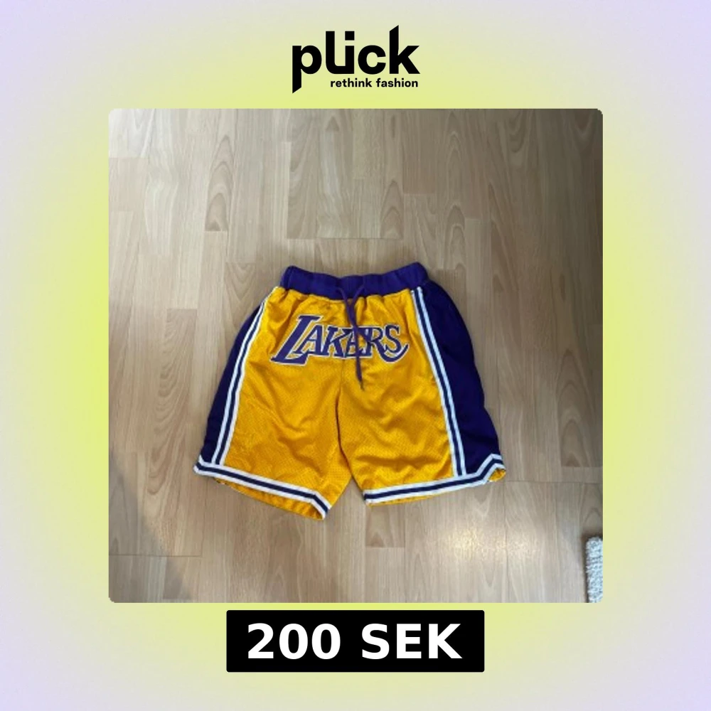 Snygga gula Lakers shorts med lila och vita detaljer. De har snörning i midjan och är perfekta för sportiga aktiviteter. Lakers-loggan är tryckt på framsidan.
