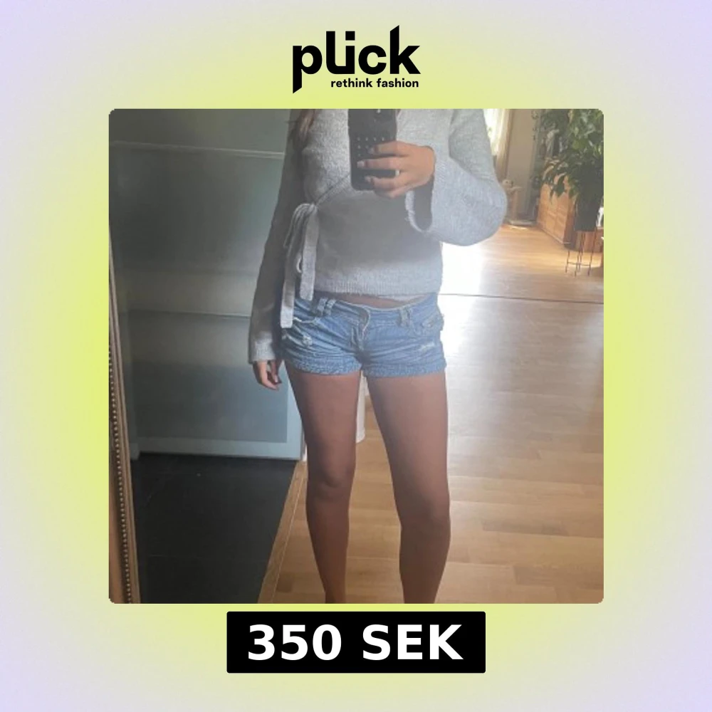 Säljer ett par blåa låga jeansshorts med slitna detaljer och snygga fickor både fram och bak. Shortsen har klassiska sömmar och knäppning framtill. Perfekta för varma dagar när du vill ha en chill och trendig look.