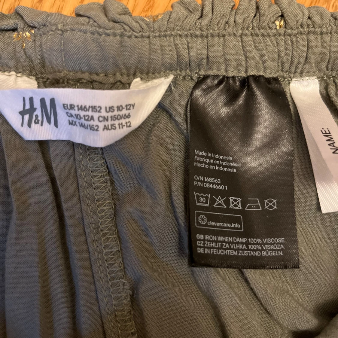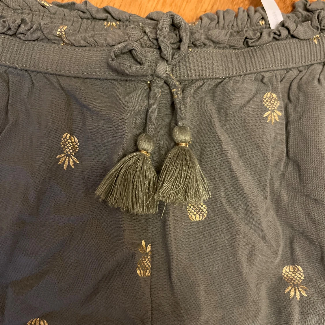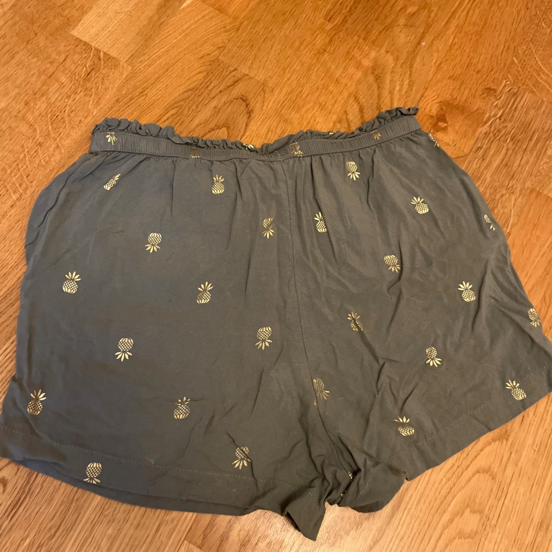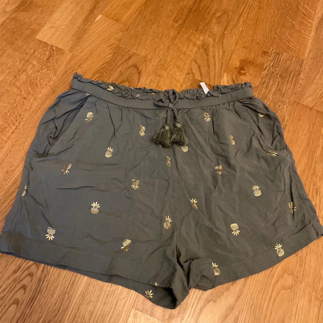 Säljer ett par gröna shorts med guldiga ananastryck från H&M, de har snörning med tofsar i midjan. De har en loose passform och elastisk midja med volangkant upptill. Kanske använda en gång så väldigt bra skick. Det står stl 146/152 men passar mig som har stl XS-S i vanliga fall. Hör gärna av er om frågor!❤️