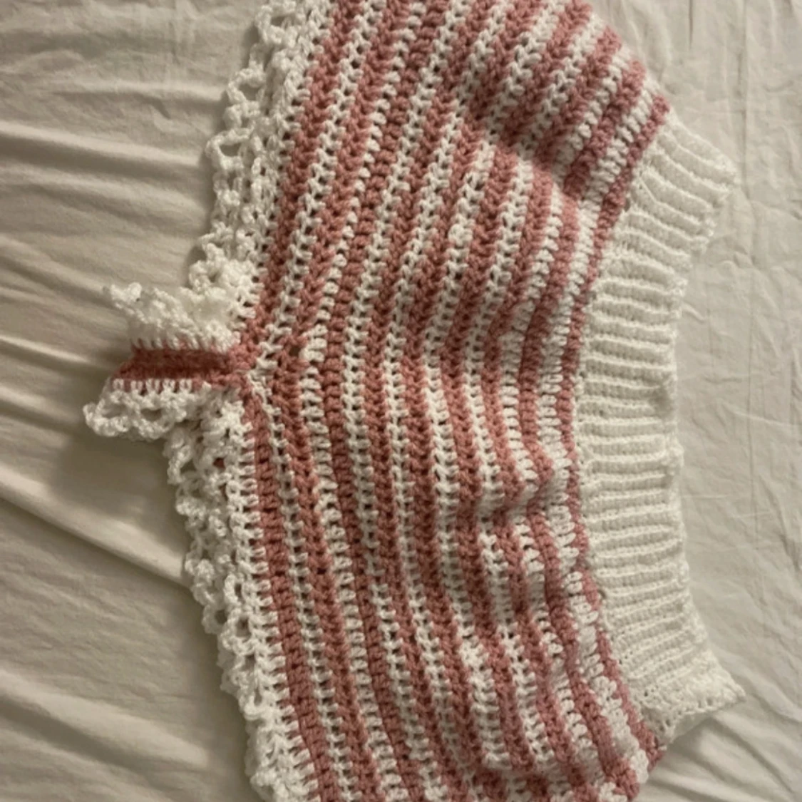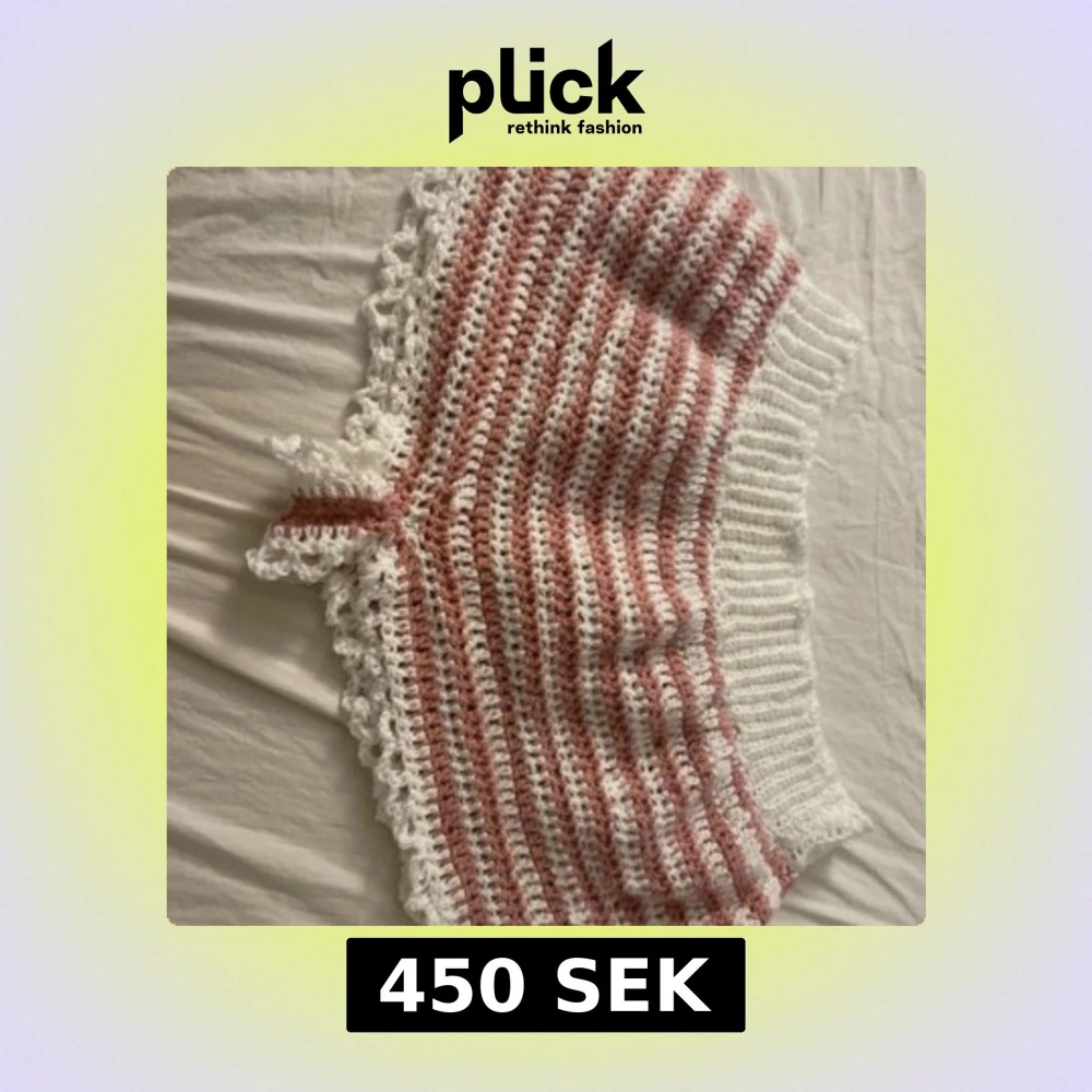Supersöta virkade shorts i vitt och rosa,med virkad spets längst ner. 100 % handgjorda av mig med kärlek och tålamod. 🧵 Gjorda på ca 30 timmar (flera dagar) 🧶 Mjukt garn 💕 Perfekta för sommaren, festival, strand eller chill hemma Unik design – det finns bara ett exemplar! Storlek: Large eller en lite större medium Skick: Helt nya, aldrig använda 🧼 Tvättråd: Handtvätt eller skonsam maskintvätt (30°), plantorkas. Om så önskas så kan jag virka ett skärp som jag antingen kan trä genom midje-mudden