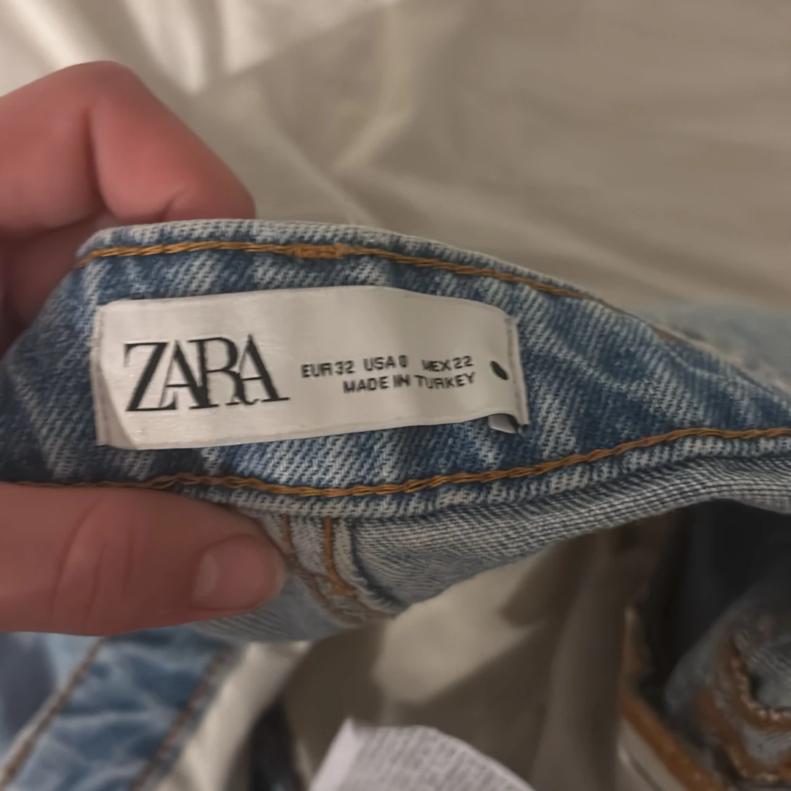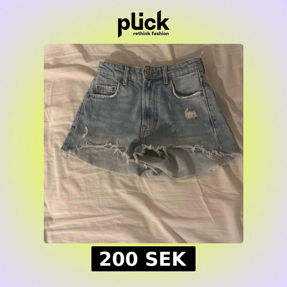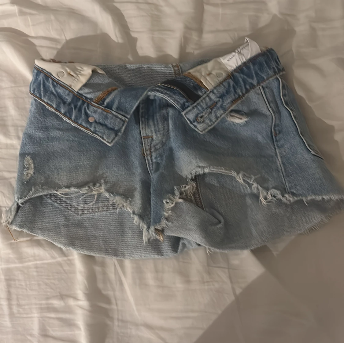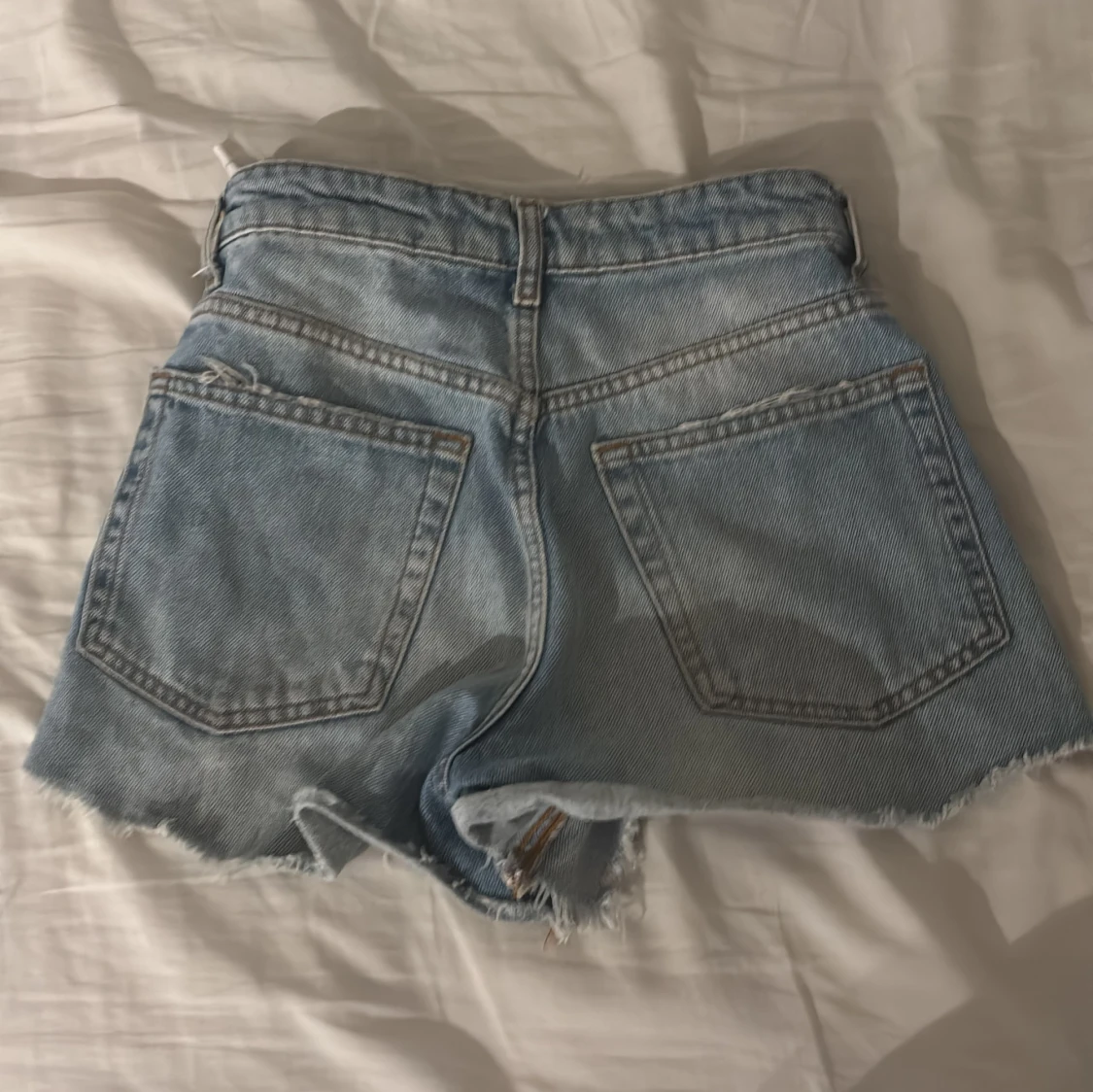 Säljer ett par ljusblå jeansshorts från Zara med råa, fransiga kanter och slitna detaljer. Klassisk femficksmodell med en högre midja så helt perfekta att vika ner. Pris kan ev. diskuteras