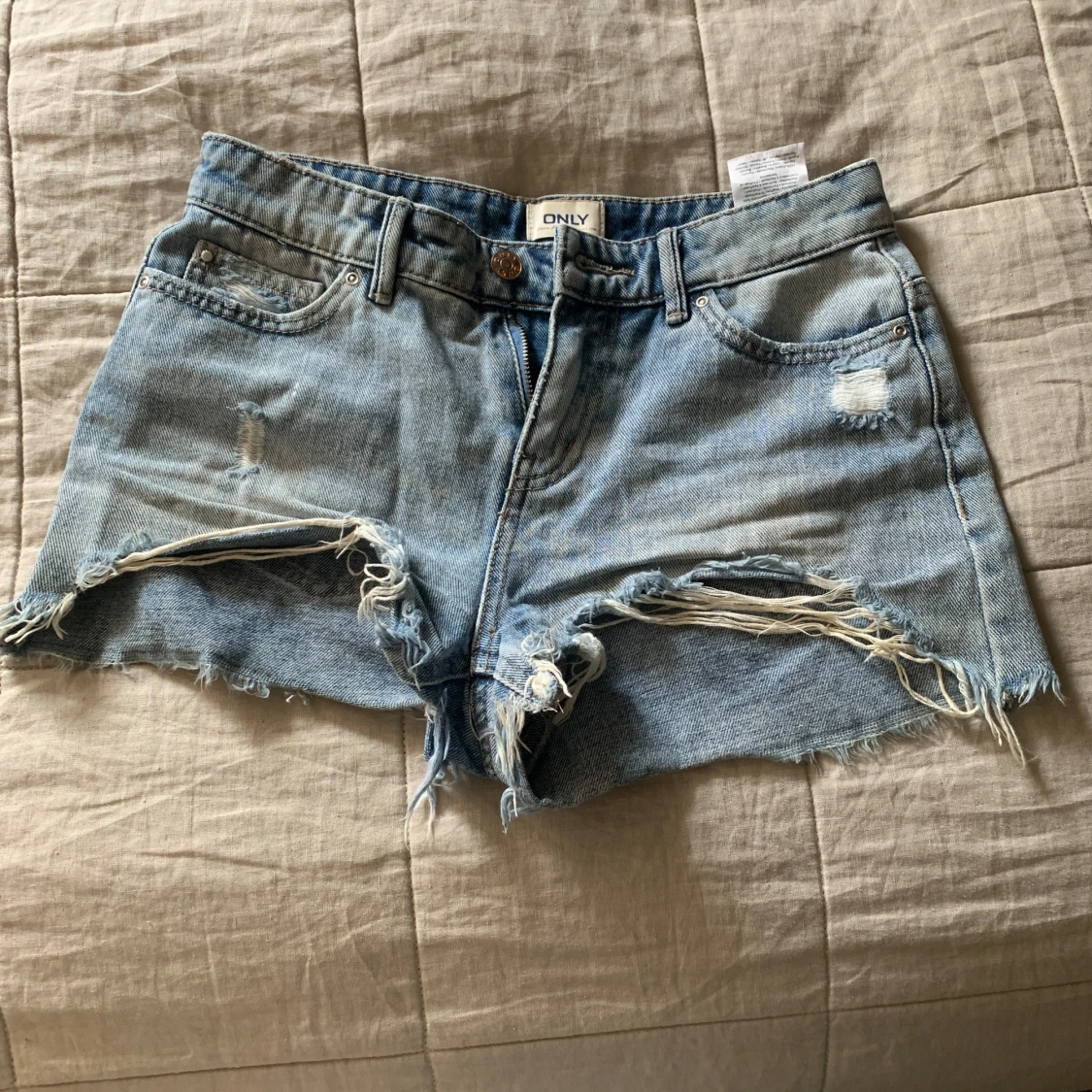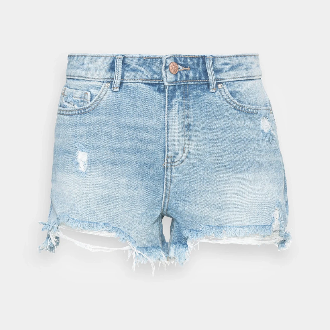 Snygga ljusblå jeansshorts från ONLY med hög midja och slitna detaljer. De har fransiga kanter, klassiska fem fickor och knappstängning fram. Perfekta för sommarens chill dagar och har en loose passform som ger en avslappnad vibe.