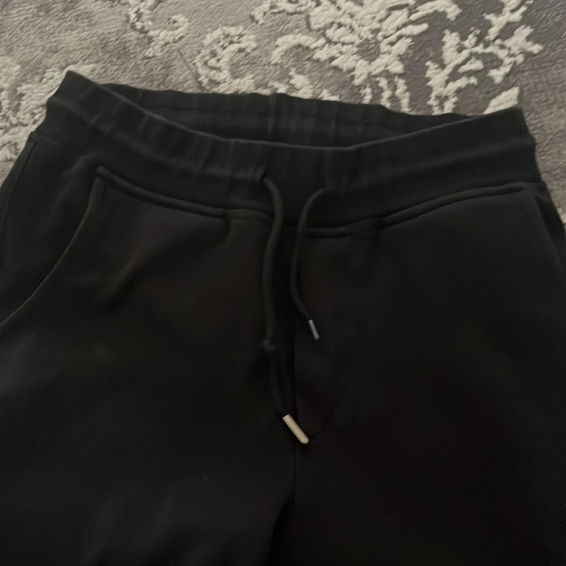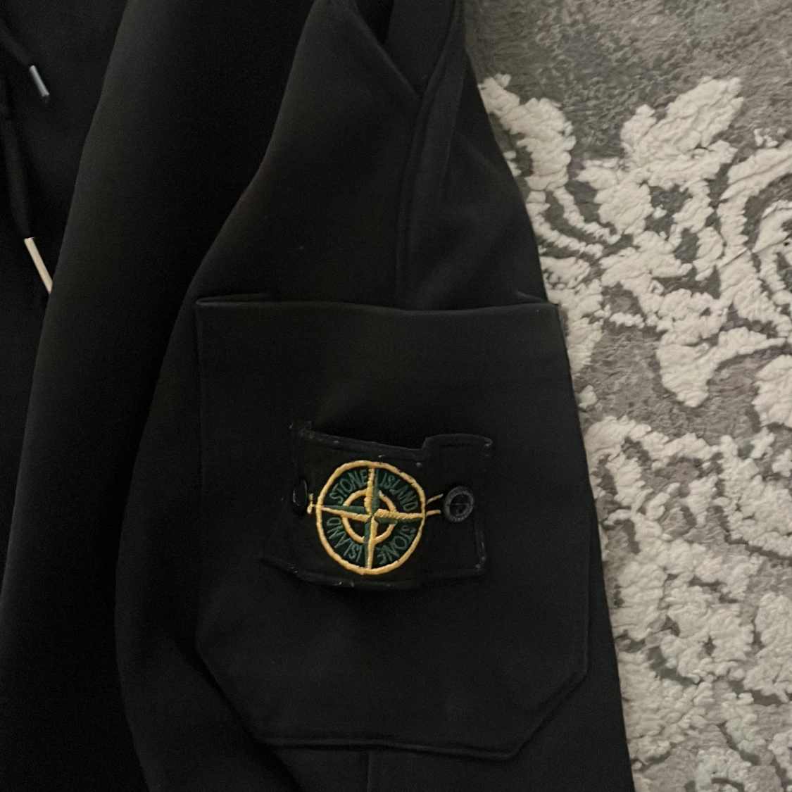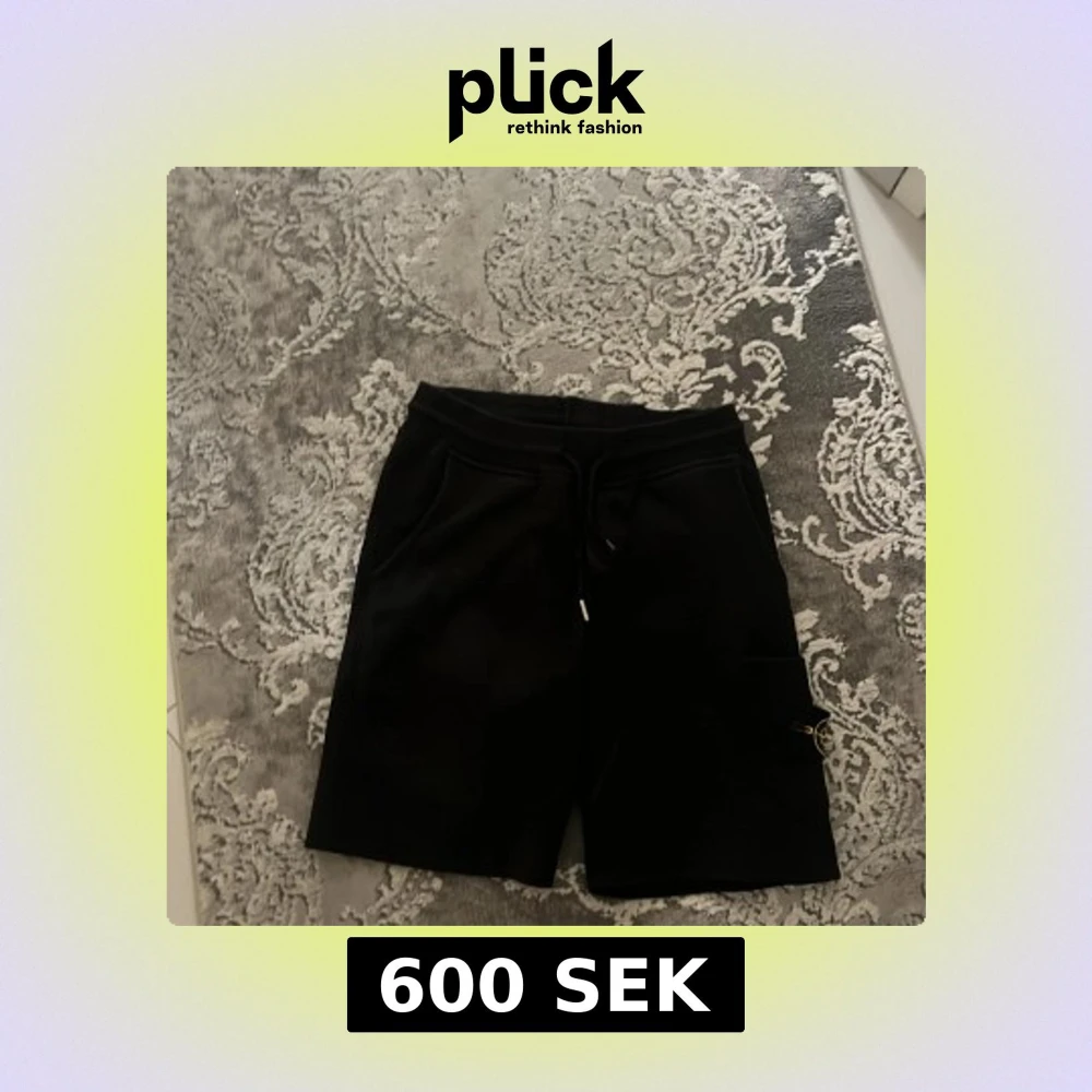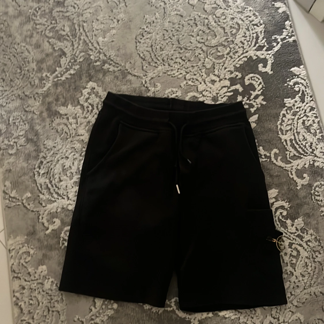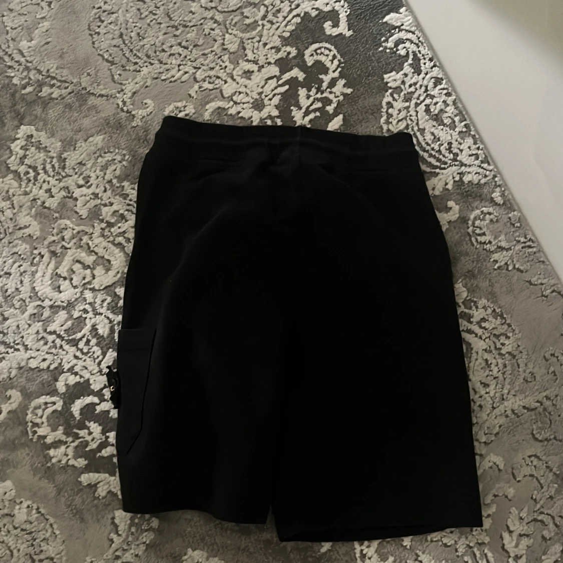 Svarta shorts från Stone Island med klassisk logotyp på benfickan. De har snörning i midjan, två sidofickor och en extra ficka med patch. Materialet är mjukt och känns som bomull, perfekt för chill dagar. Snygg och enkel design som funkar till streetwear.
