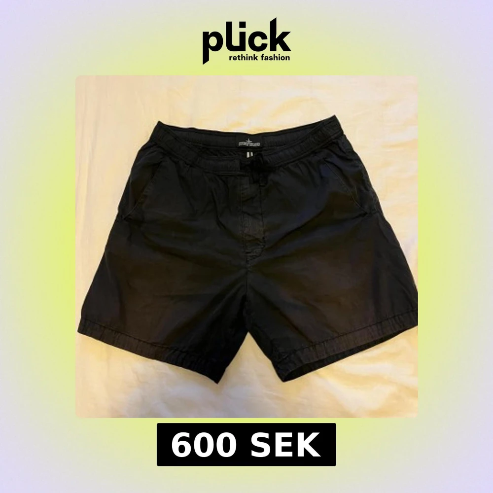 Stone island shorts I perfekt skick förutom att en knapp saknas där bak. Ifalla man vill sätta på en badge. Dom är äkta går att skanna qr koden. Är lite osäker på storleken. Det står 46. Men passar mig som har 32 midja.