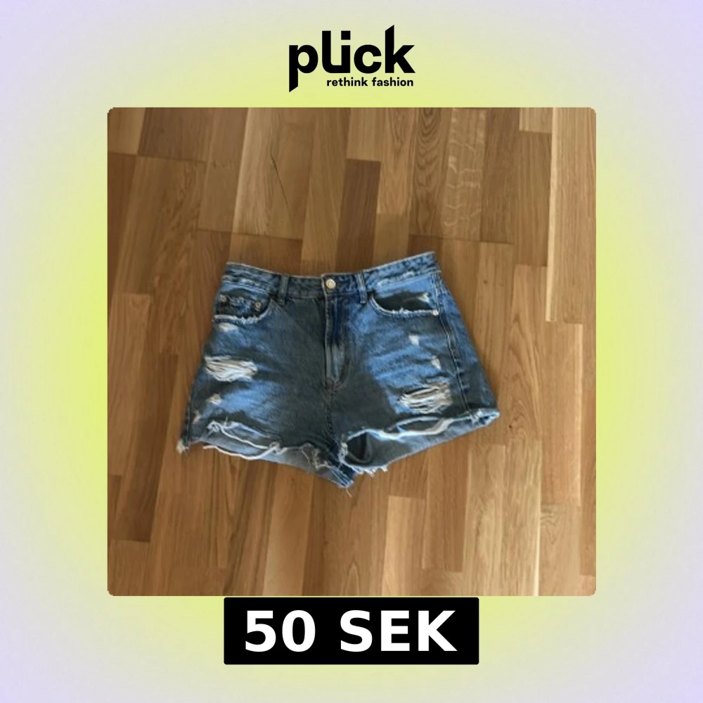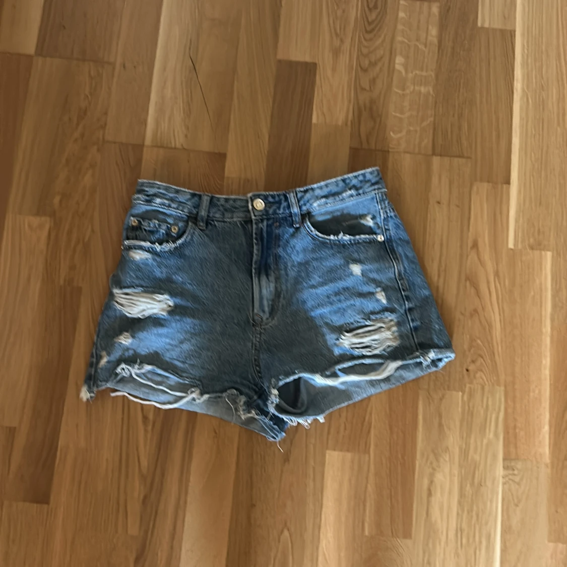 Säljer ett par blå jeansshorts från Stradivarius med hög midja och slitna detaljer framtill. Shortsen har råa kanter nertill och klassiska fem fickor. Perfekta för sommaren!