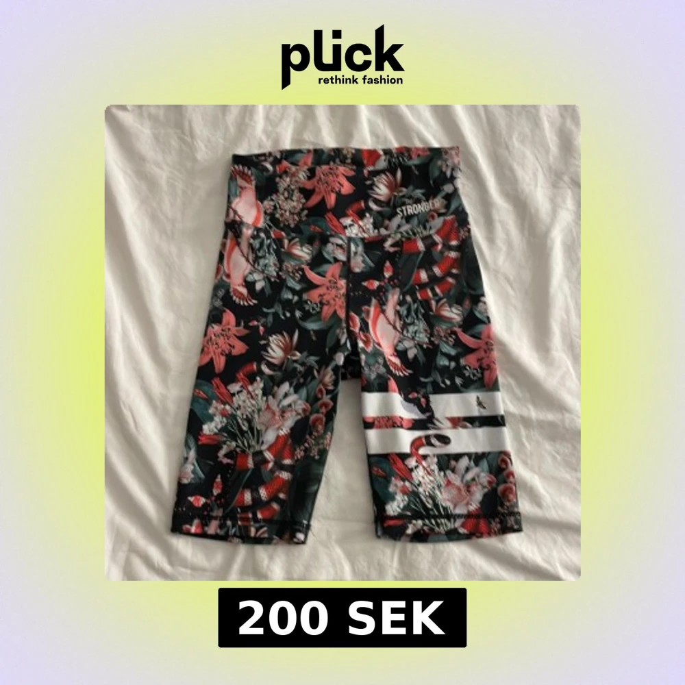 Snygga högmidjade cykelshorts från Stronger i svart med blommigt mönster i rosa, rött och grönt. Perfekta för träning och har två coola vita ränder på ena benet.
