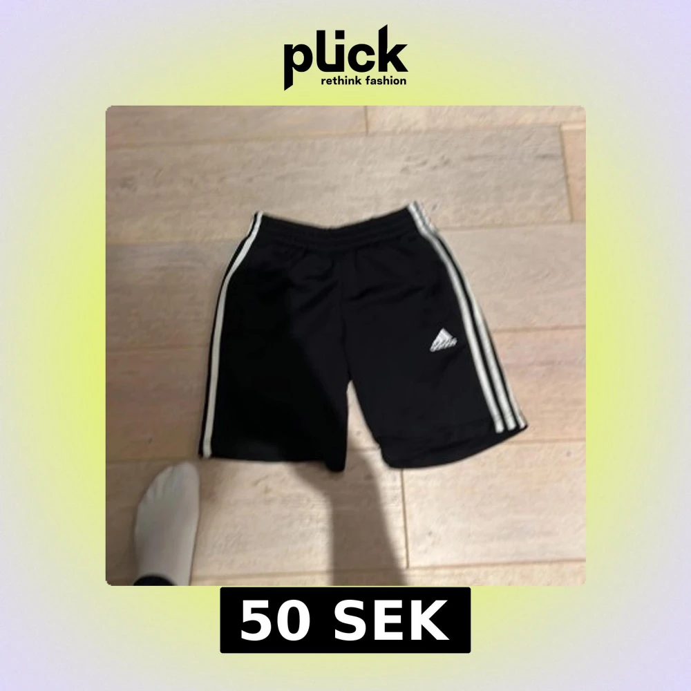 Svarta sportiga shorts från Adidas med klassiska vita ränder längs sidorna och Adidas-logga på ena benet. Elastisk midja för skön passform. Perfekta för träning eller chill. Materialet är lätt och känns svalt mot huden. Finns knotter över större del av varan därför pris.