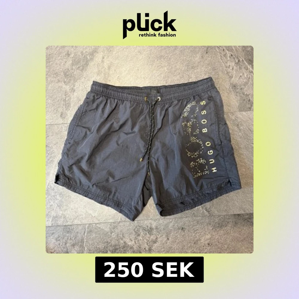 Svarta badshorts från Hugo Boss med gulddetaljer och logga på vänster ben. Shortsen har snörning i midjan, innerbyxa i mesh och en bakficka med knapp och en lite innerficka. Perfekta för stranden eller poolen.