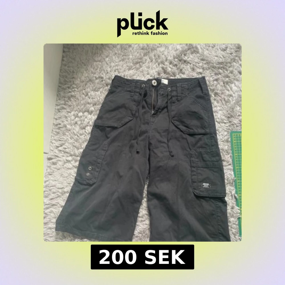 Svarta jorts från BDG Urban Outfitters i storlek XS. Modellen har flera stora fickor, snörning i midjan och klassisk cargo-look. Perfekta för en chill streetstyle. Materialet känns som bomull och shortsen har en loose passform.