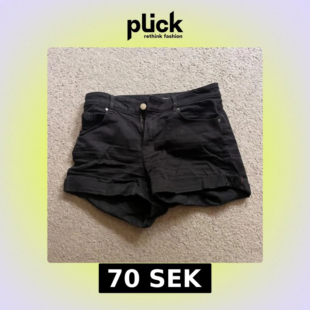 Svarta jeansshorts med klassisk femficksdesign och uppvikta benslut. De har normal passform och stängs med dragkedja och knapp. Perfekta för sommardagar och enkla att matcha med allt.