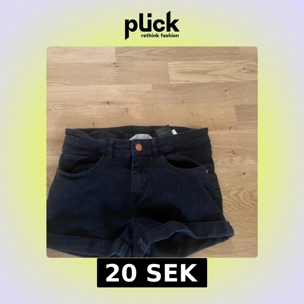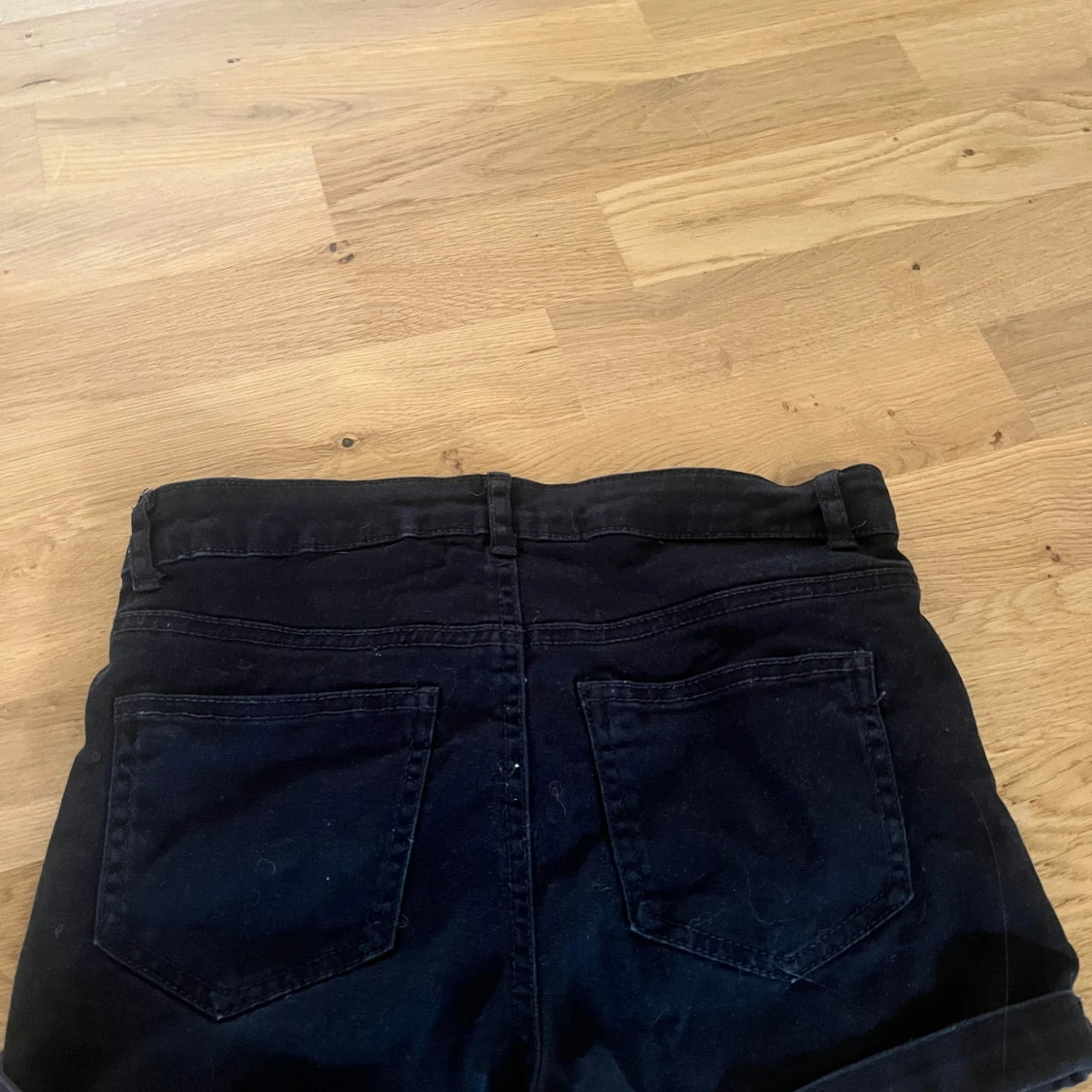 Svarta jeansshorts från H&M med klassisk femficksdesign och uppvikta benslut. Modellen har normal passform och midwaist, med knapp och dragkedja framtill samt hällor för bälte. Perfekta för en chill och stilren look.