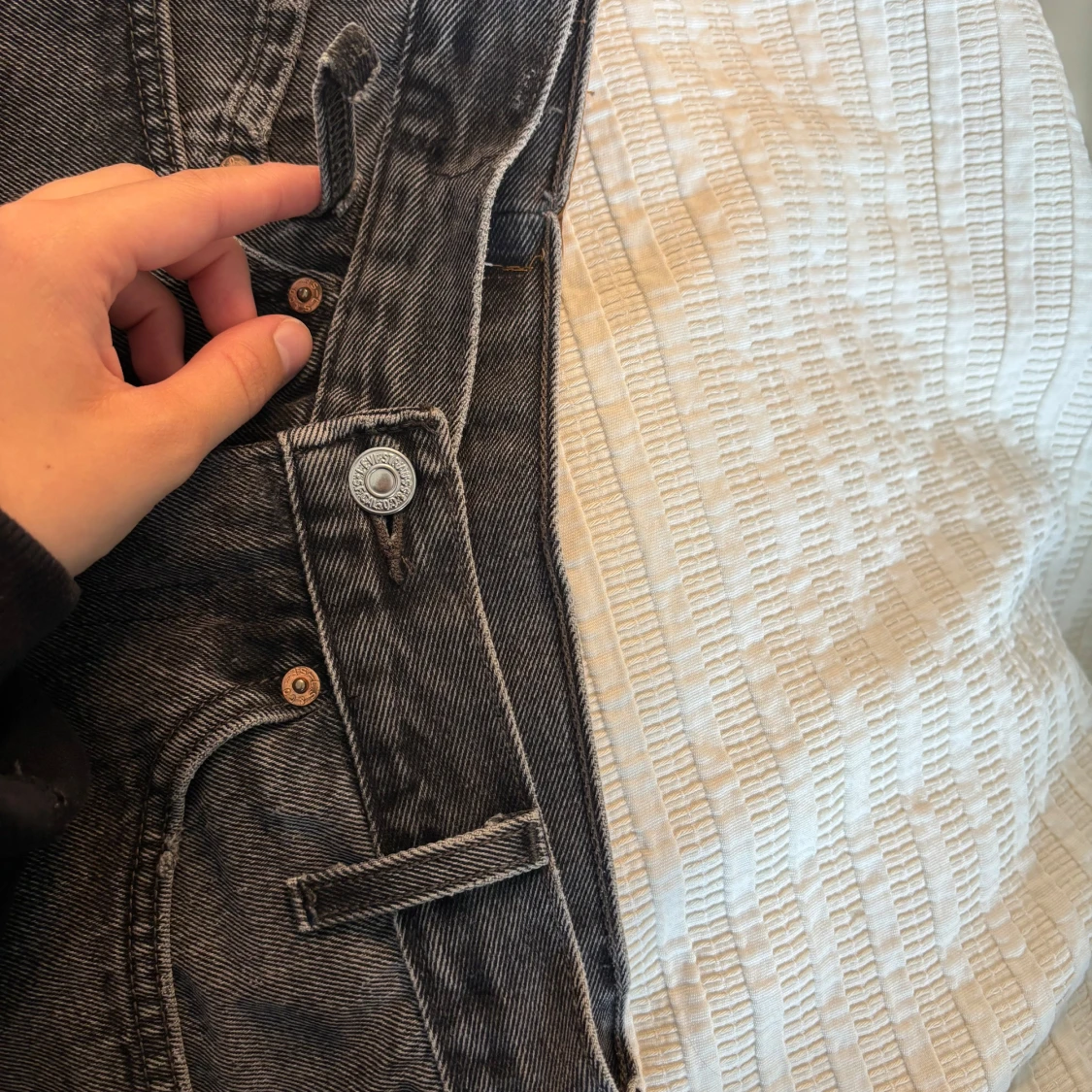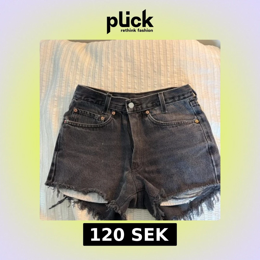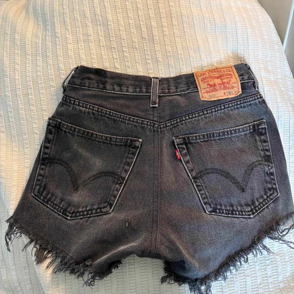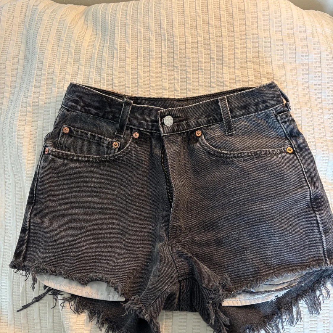 Säljer ett par svarta jeansshorts från Levi's med fransig kant och klassiska fem fickor. Shortsen har hög midja och knappgylf. Perfekta till sommaren för en avslappnad look.
