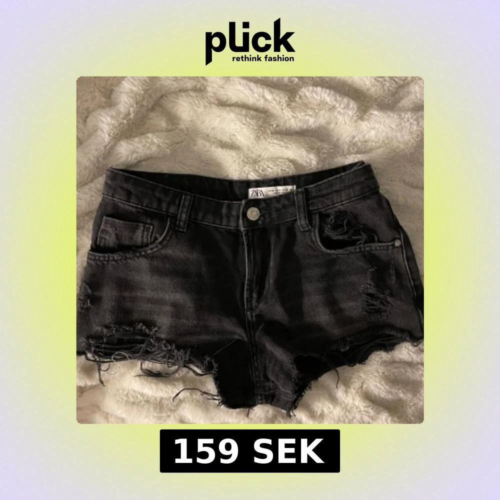 Snygga svarta jeansshorts från Zara med slitna detaljer och fransig kant. Perfekta för en avslappnad stil. De har en klassisk femficksdesign och knappgylf.