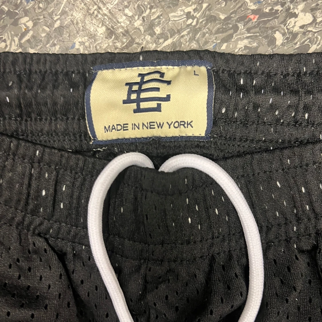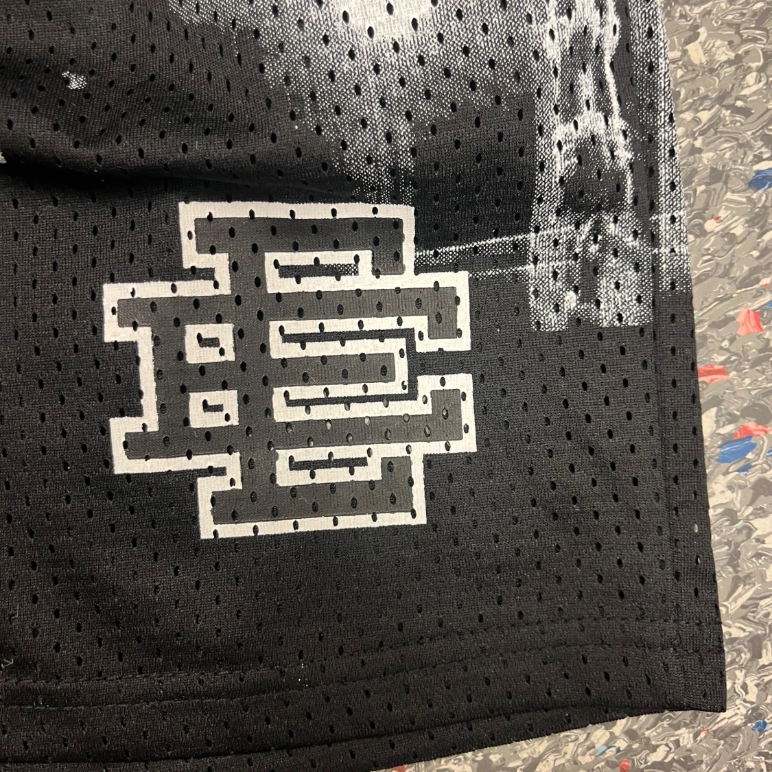 Svarta meshshorts från Eric Emanuel med vit snörning i midjan och coolt stadsmotiv i vitt och grått framtill. Shortsen har elastisk midja och är perfekta för en sportig streetwear-look. EE-loggan är tryckt på ena benet. Grymma för sommaren eller träning!