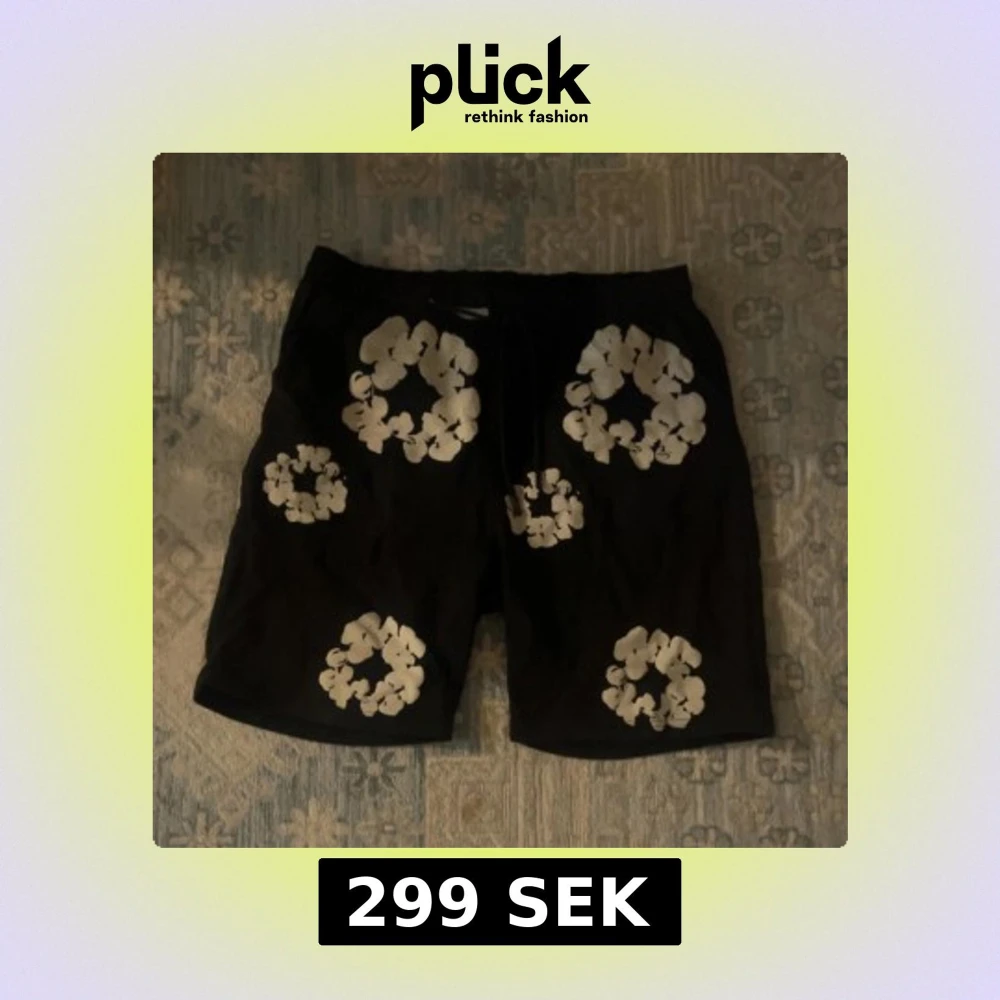 Denim tears. Svarta shorts med vita blommönster i cirklar över hela tyget. De har en loose passform och snörning i midjan för att justera storleken. Perfekta för sommarens chill dagar och har en skön, avslappnad vibe.