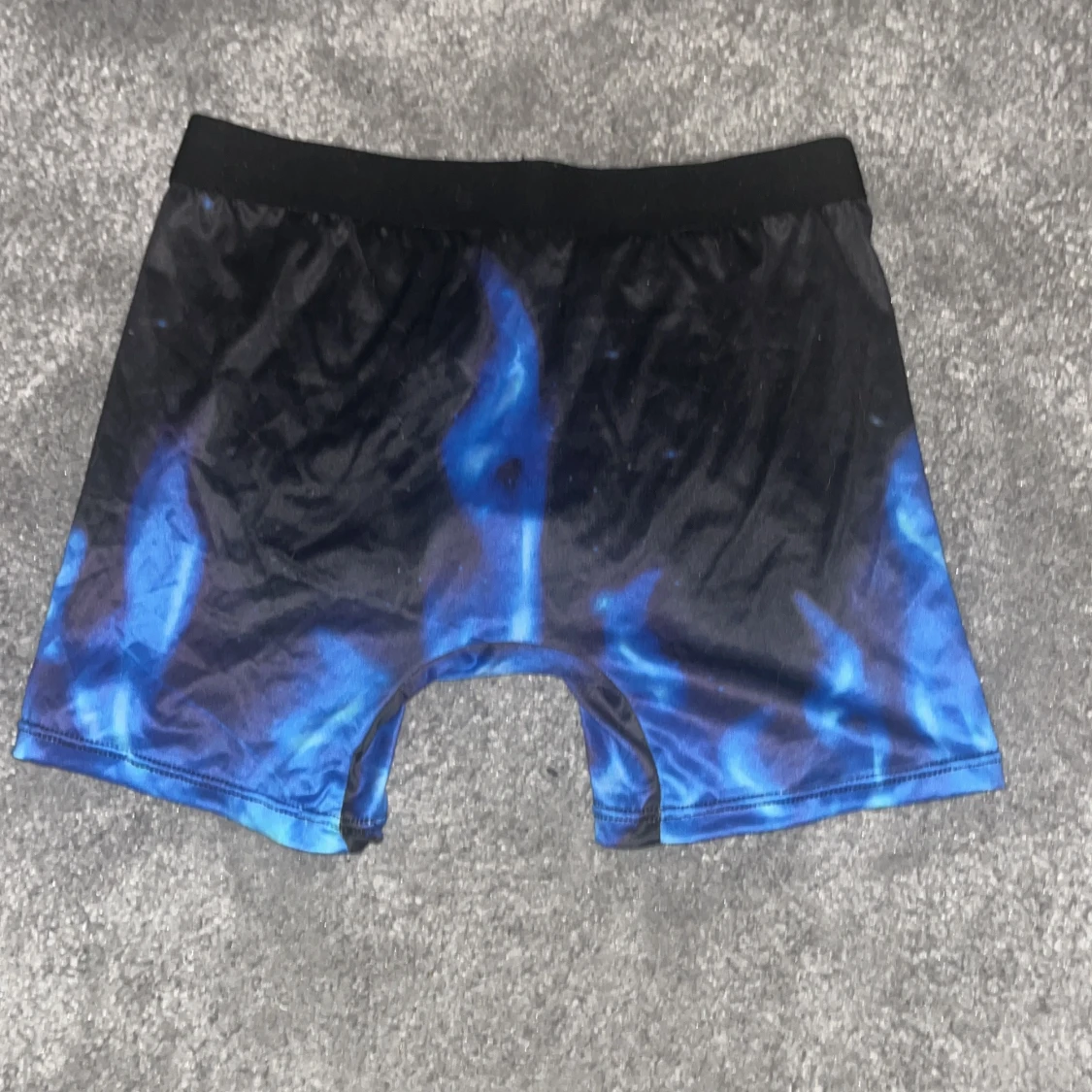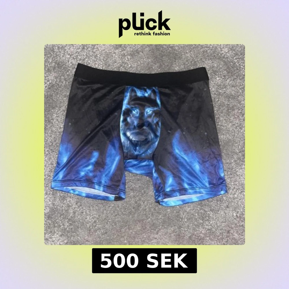 Coola shorts i svart och blått med ett stort vargmotiv framtill. De har en elastisk midja och är tillverkade i ett stretchigt material av polyester och spandex. Perfekta för dig som vill sticka ut med ett unikt tryck och bekväm passform.