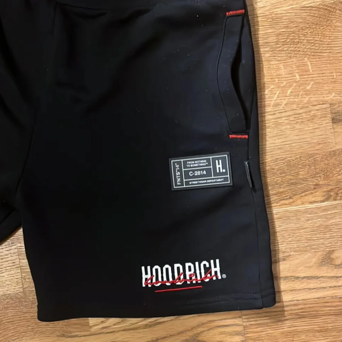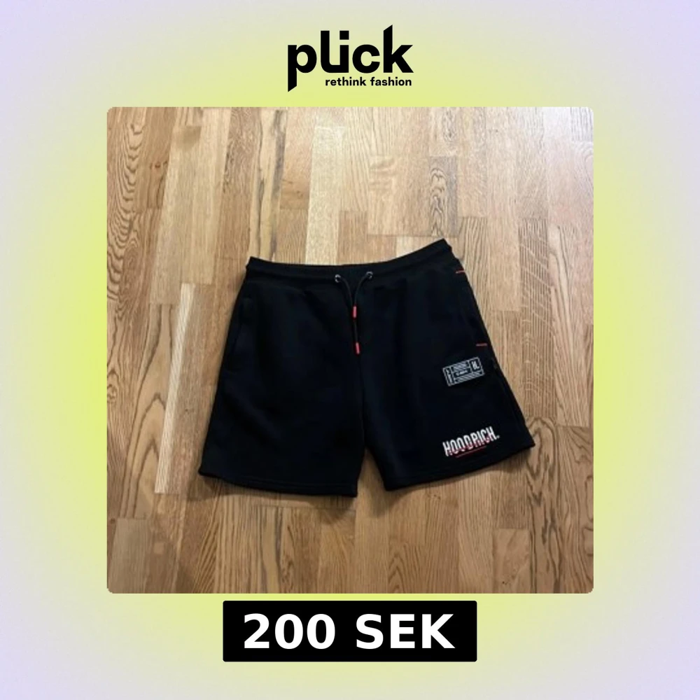 Snygga svarta shorts från Hoodrich med snörning i midjan och coola tryckdetaljer. Perfekta för en avslappnad stil. Använda 3-4 ggr max kn fixa priset vid snabb köp