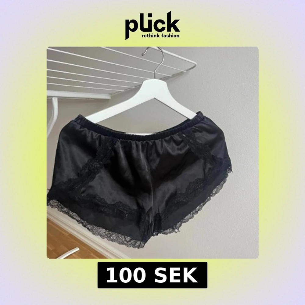 Snygga svarta shorts i silkesliknande material med bred spetskant längs benen och dekorativa spetsdetaljer framtill. De har elastisk midja och en loose passform, perfekta för chill eller som pyjamasshorts. Riktigt mjuka och sköna!