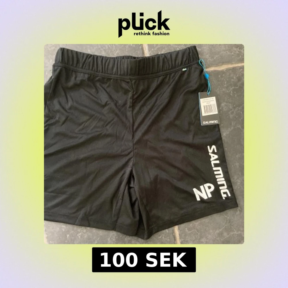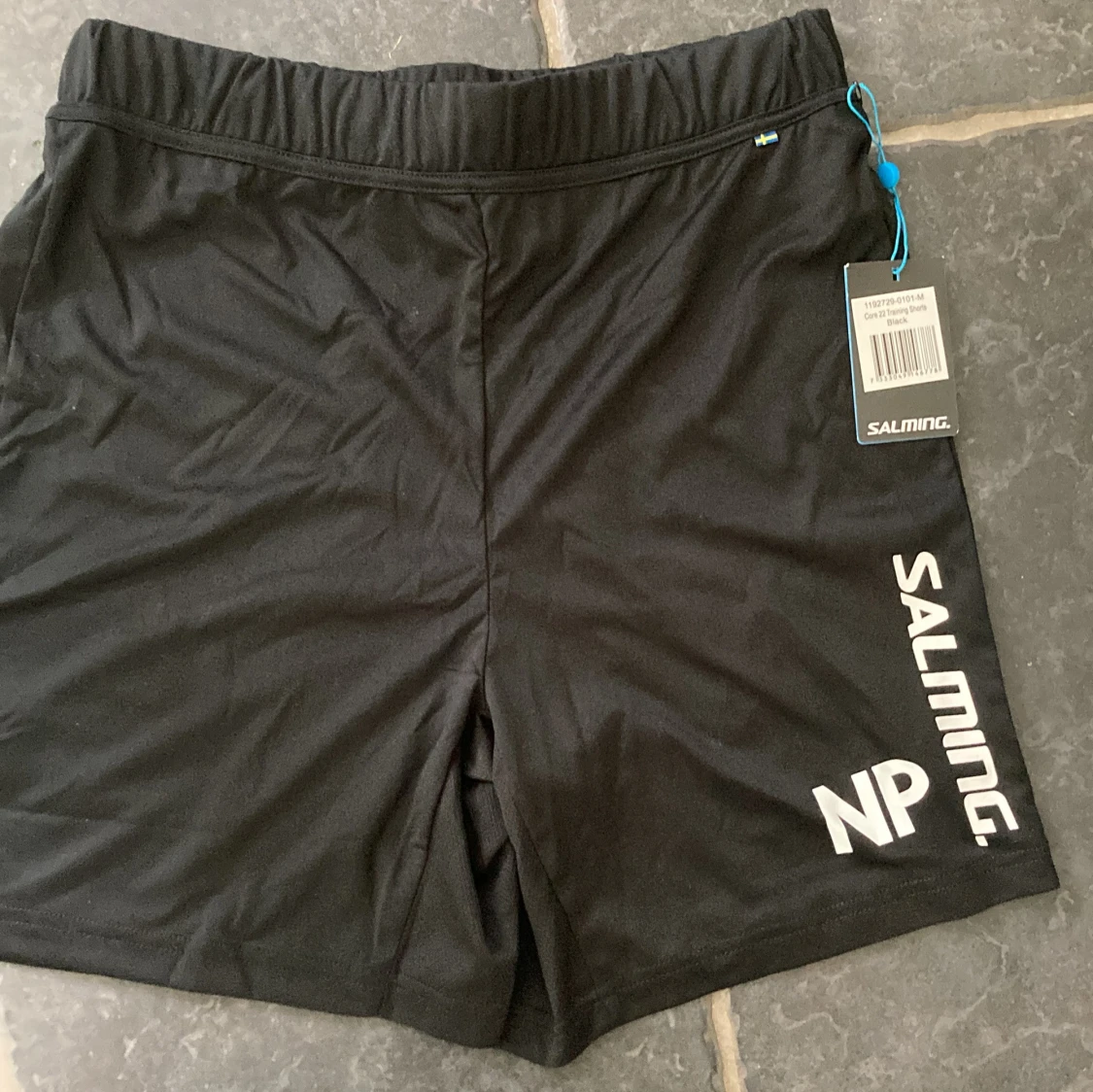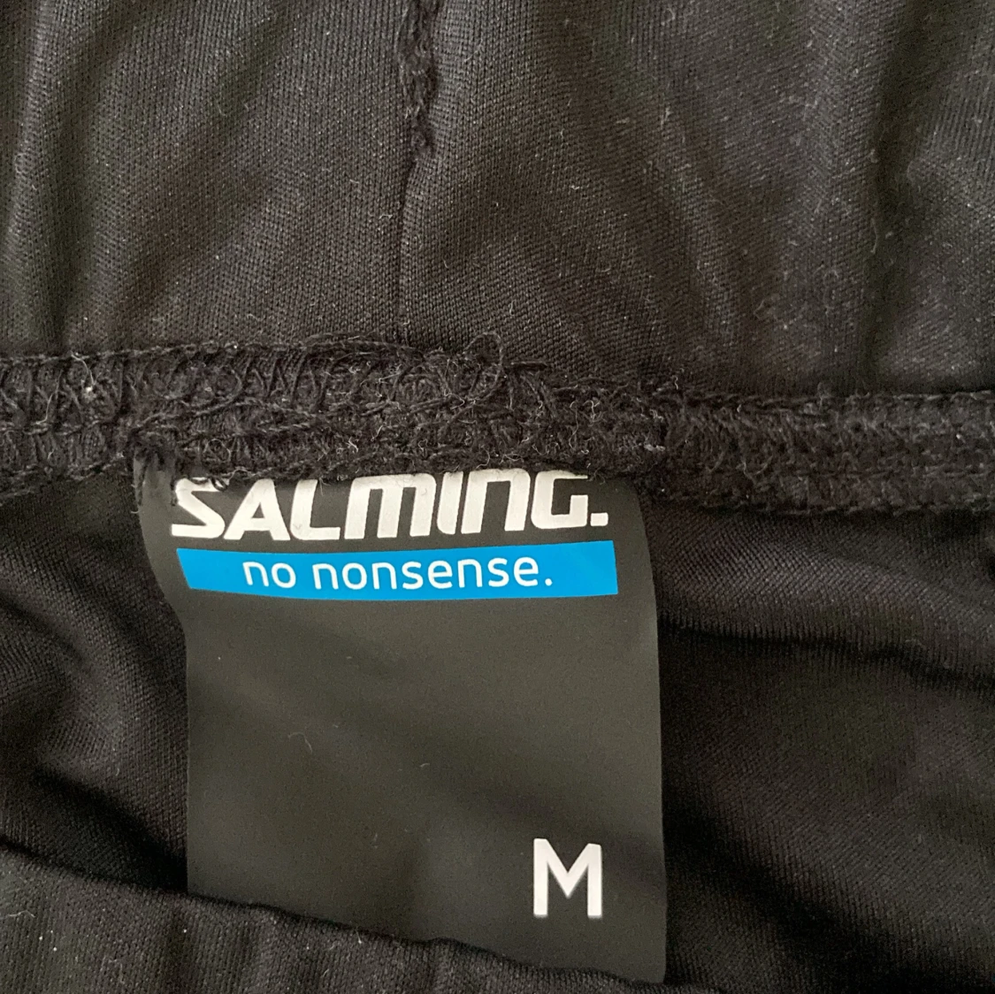 Svarta sportiga shorts från Salming med vit logga på ena benet. De har elastisk midja och är tillverkade i ett lätt och smidigt syntetmaterial som passar perfekt för träning. Snygg minimalistisk design och bekväm passform. Felköp