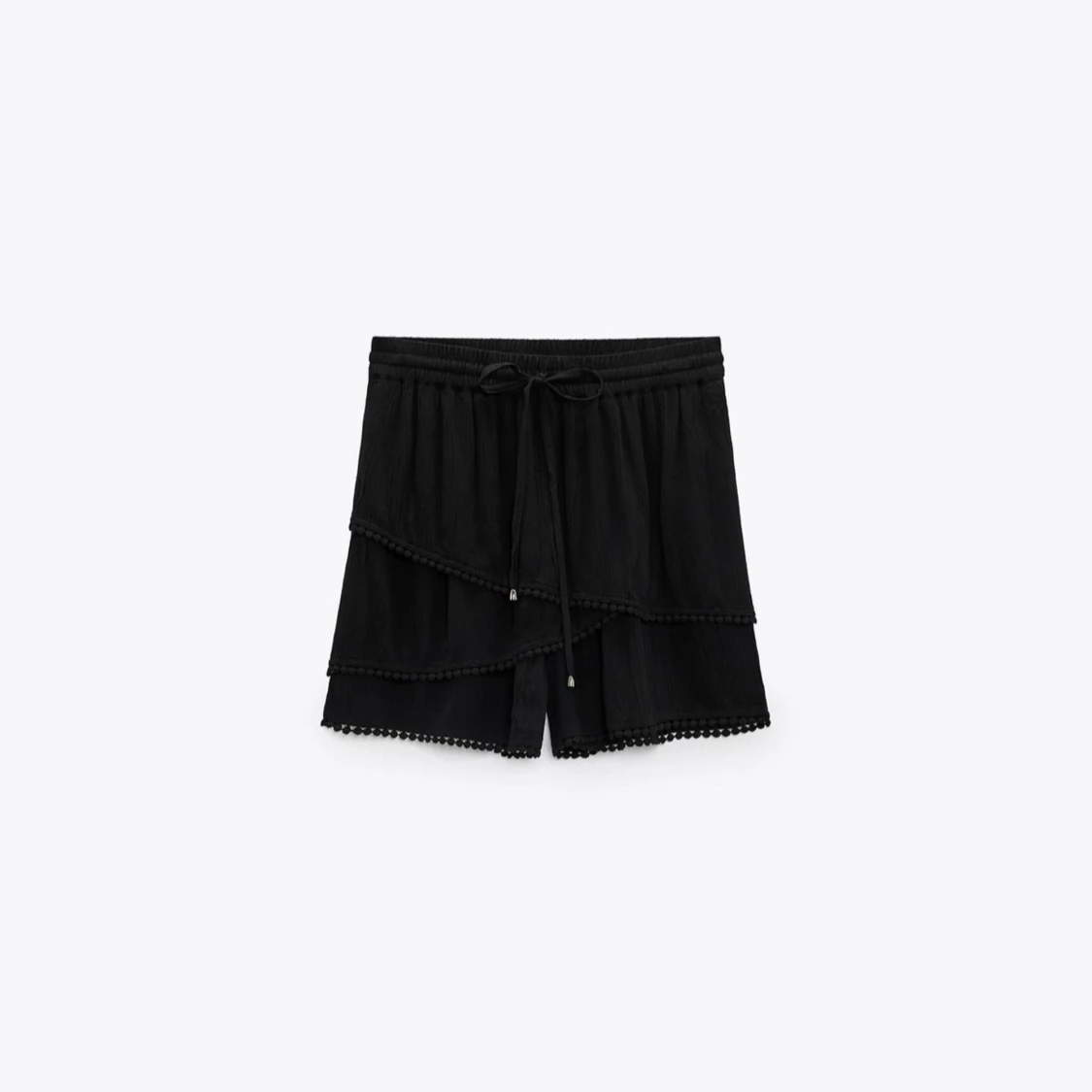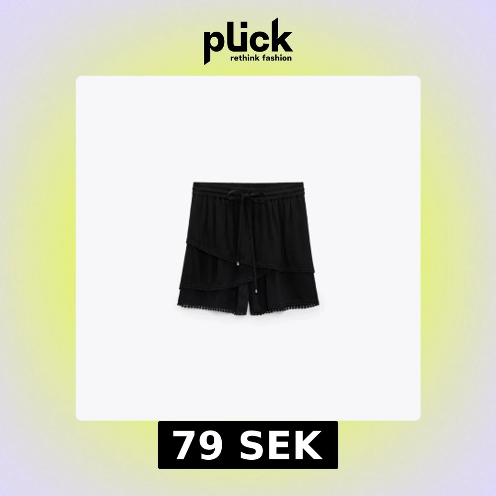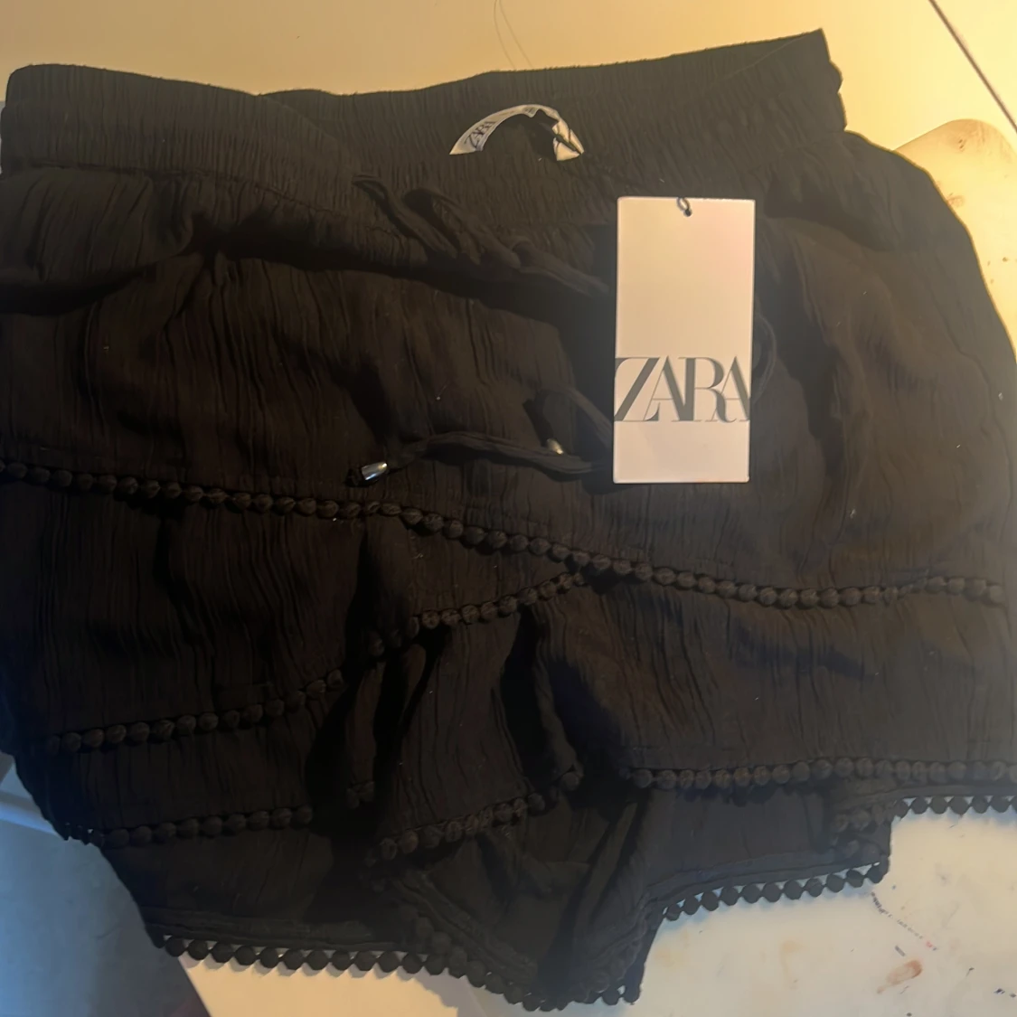 Svarta shorts från Zara med volangdetaljer och små bollar längs kanterna. De har snörning i midjan och är tillverkade i ett lätt, luftigt tyg som passar perfekt för varma dagar. Snygg och trendig modell med avslappnad passform. Aldrig använd och prislapp kvar!