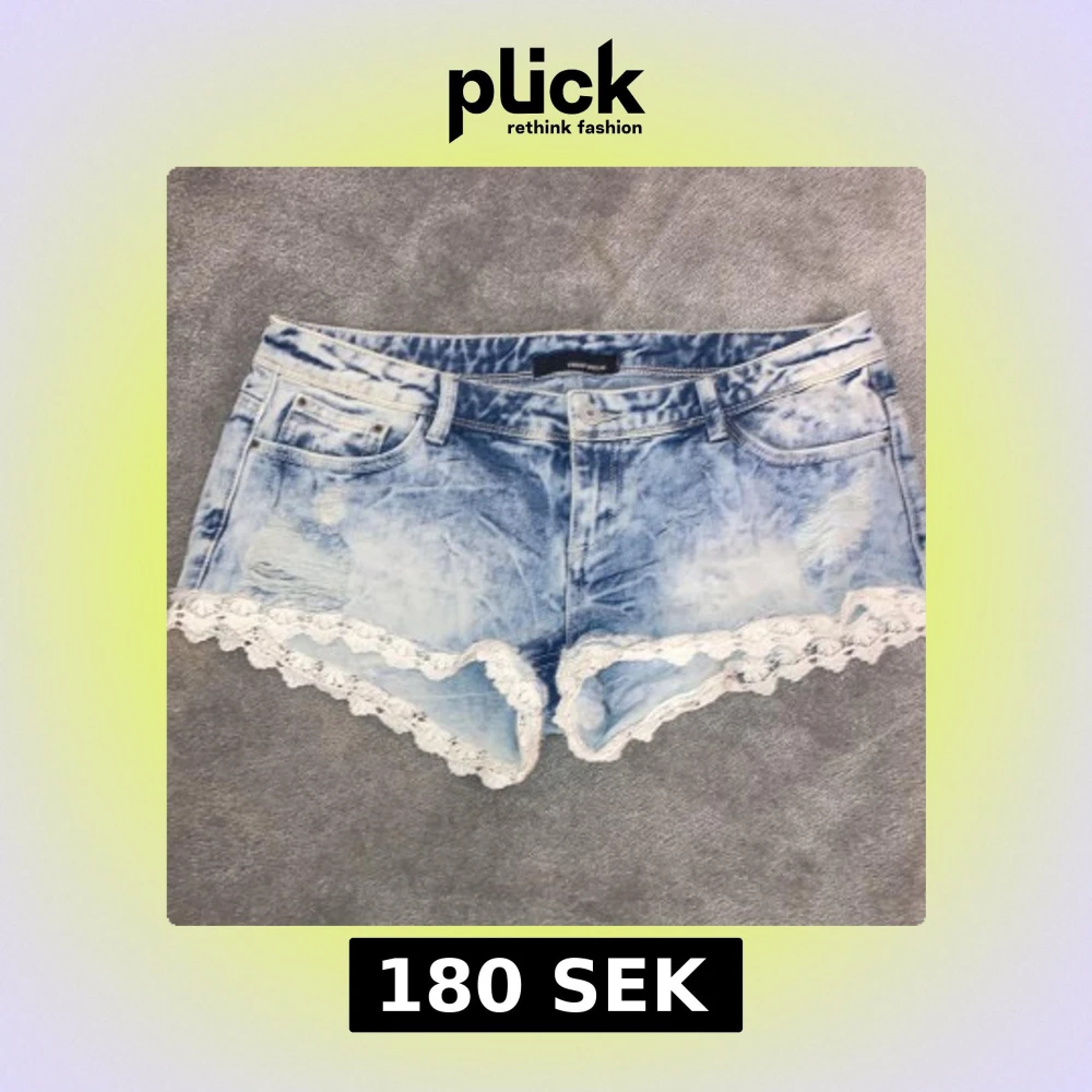 Snygga ljusblå jeansshorts från Tally Weijl med coola slitningar och vit spetsdetalj längs kanten. Perfekta för en avslappnad sommarlook. De har en knapp och dragkedja framtill samt klassiska fem fickor. Mått tvärsöver:41 längde:22cm. Står inte storlek men passar mig som är S-M