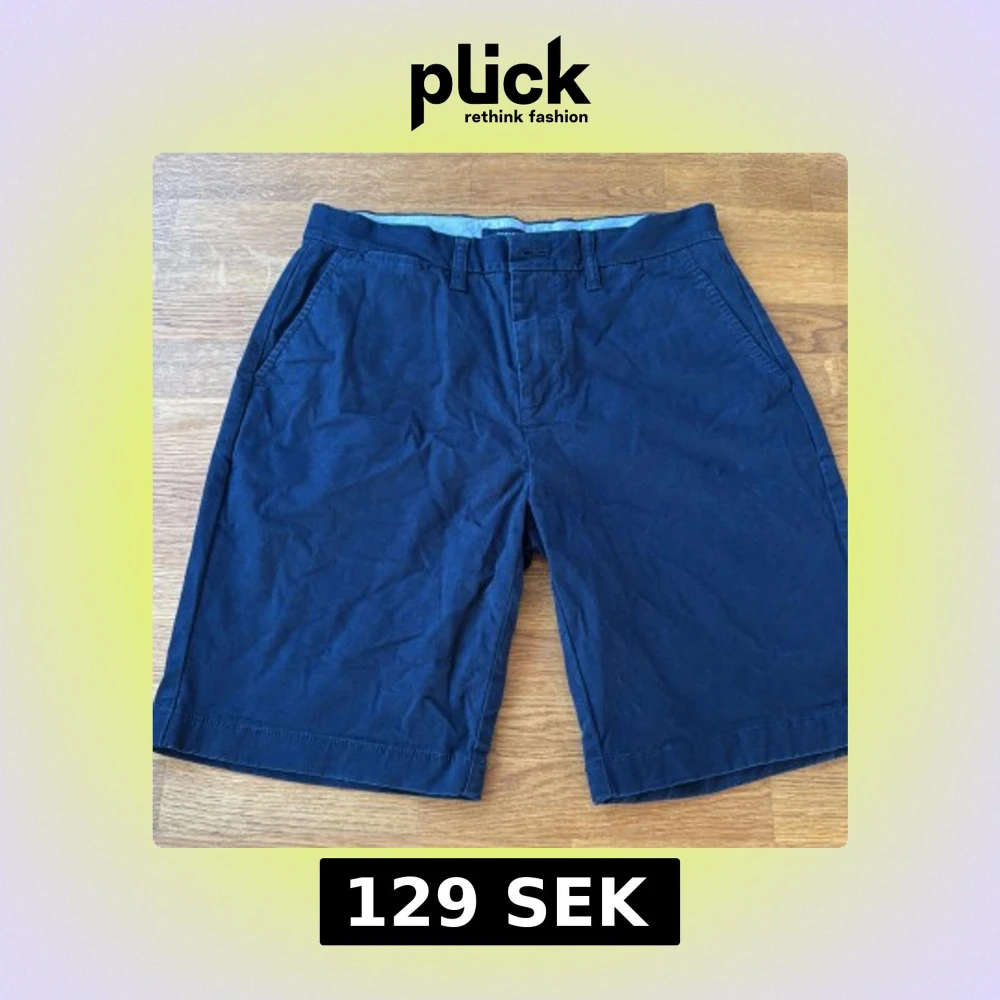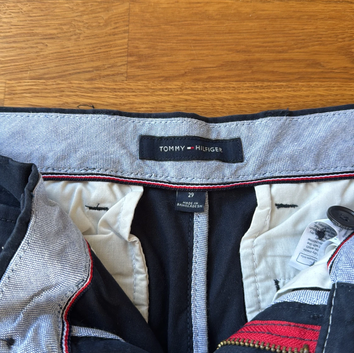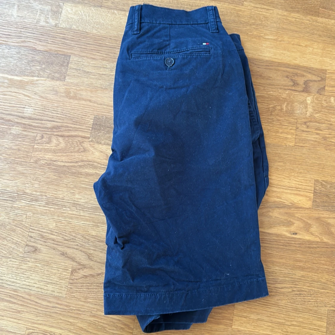 Snygga marinblå shorts från Tommy Hilfiger med klassisk design och raka ben. De har fickor fram och bak, bälteshällor och stängs med knapp och dragkedja. Materialet är mjuk bomull, perfekt för varma dagar. Diskret Hilfiger-logga på bakfickan. 29 motsvarar S ungefär, lite hårig annars grymt skick