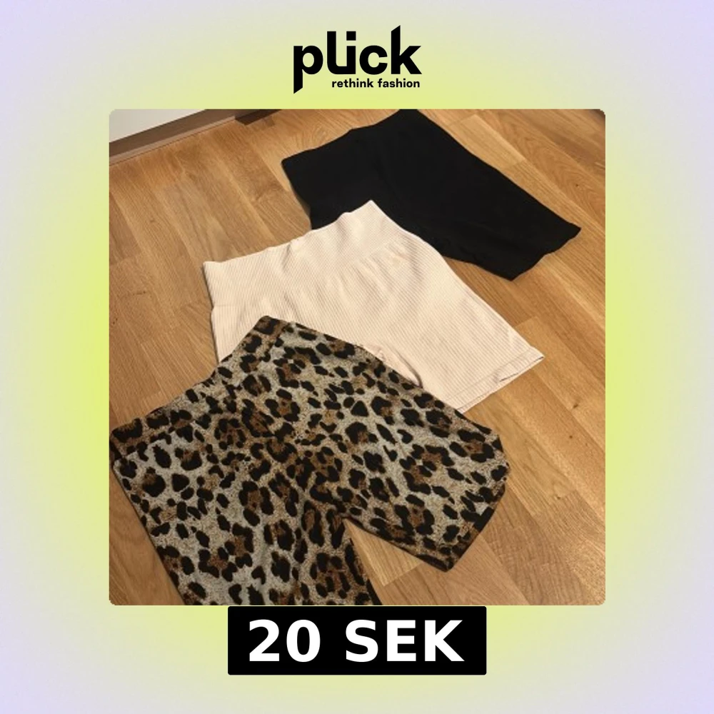 Säljer tre par cykelshorts/träningsorts: ett par med leopardmönster i svart och brunt, ett par ribbade ljusrosa och ett par ribbade svarta. Alla har hög midja och stretchigt material, perfekta för sommaren eller gymmet! 20kr/st