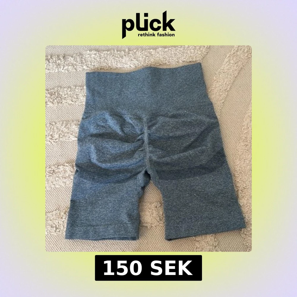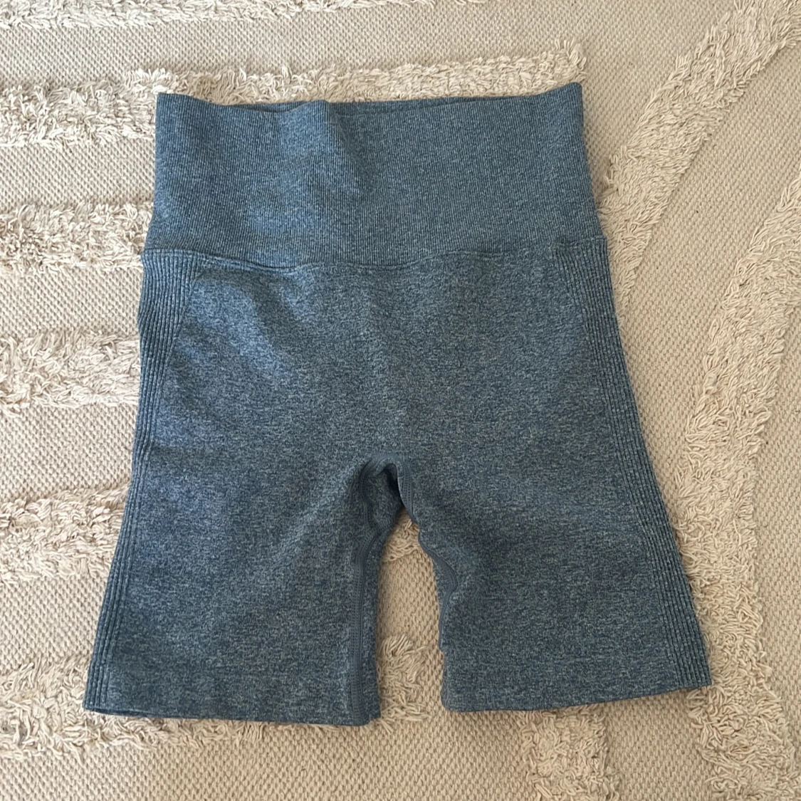 Säljer ett par blå seamless träningsshorts med hög midja och ribbad kant. Materialet är stretchigt och består av polyamid, polyester och elastan. Perfekta för gymmet eller andra sportaktiviteter. Snygg scrunch-detalj bak för extra passform.