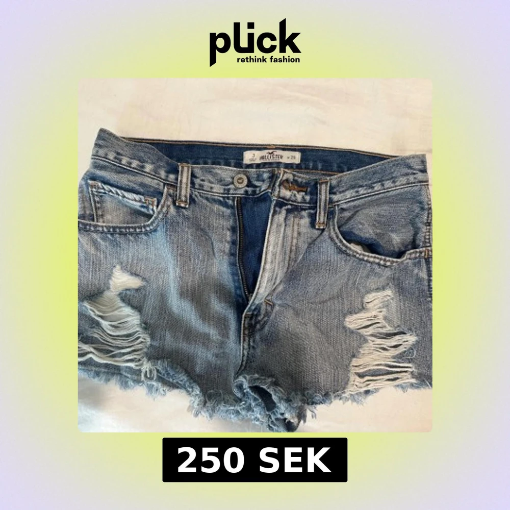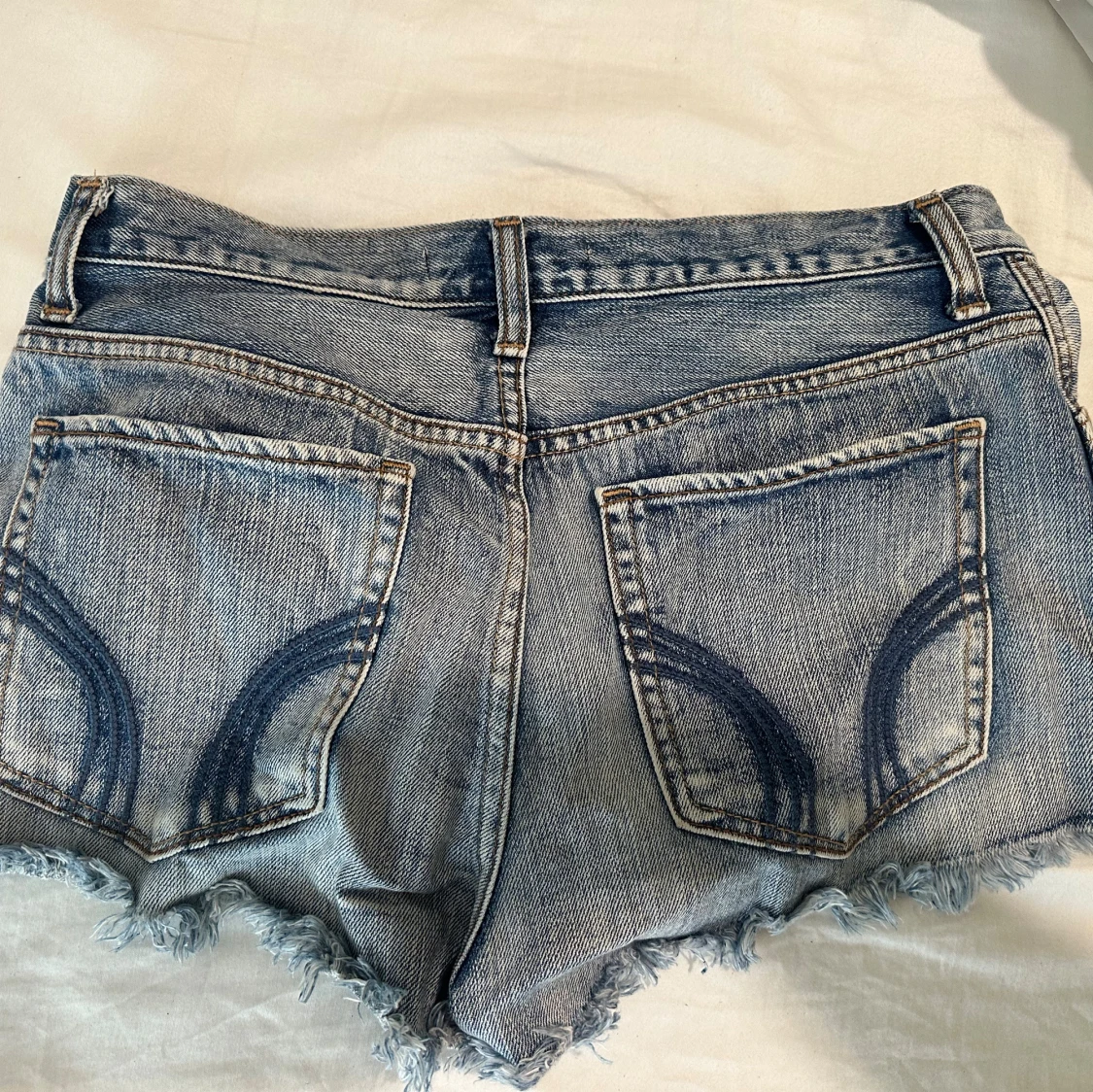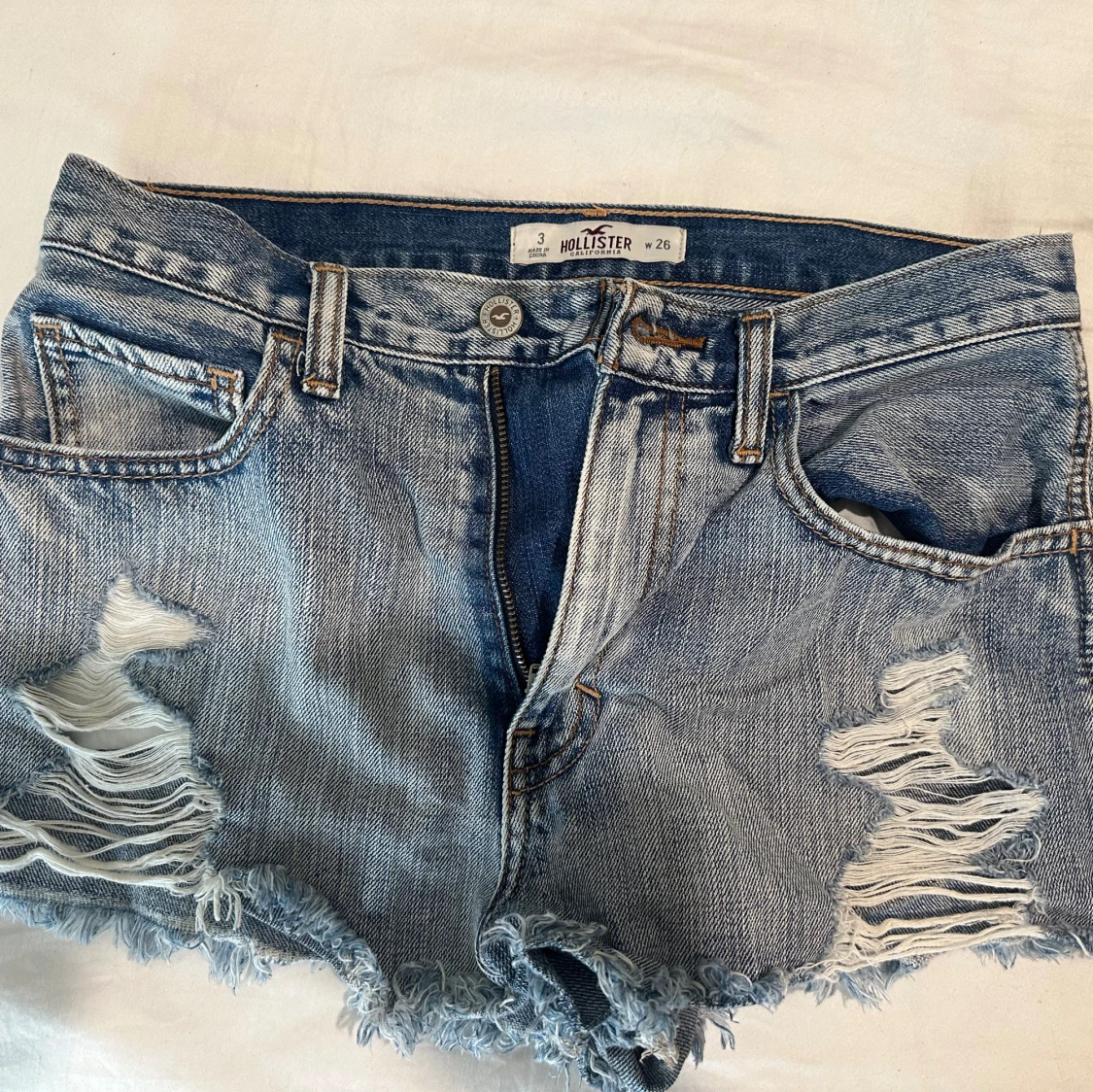 Snygga blå jeansshorts från Hollister med råa, fransiga kanter och slitna detaljer framtill. Klassisk femficksmodell med knapp och dragkedja.
