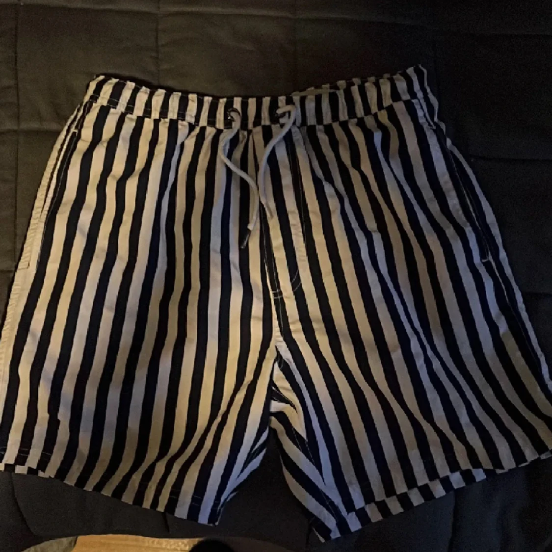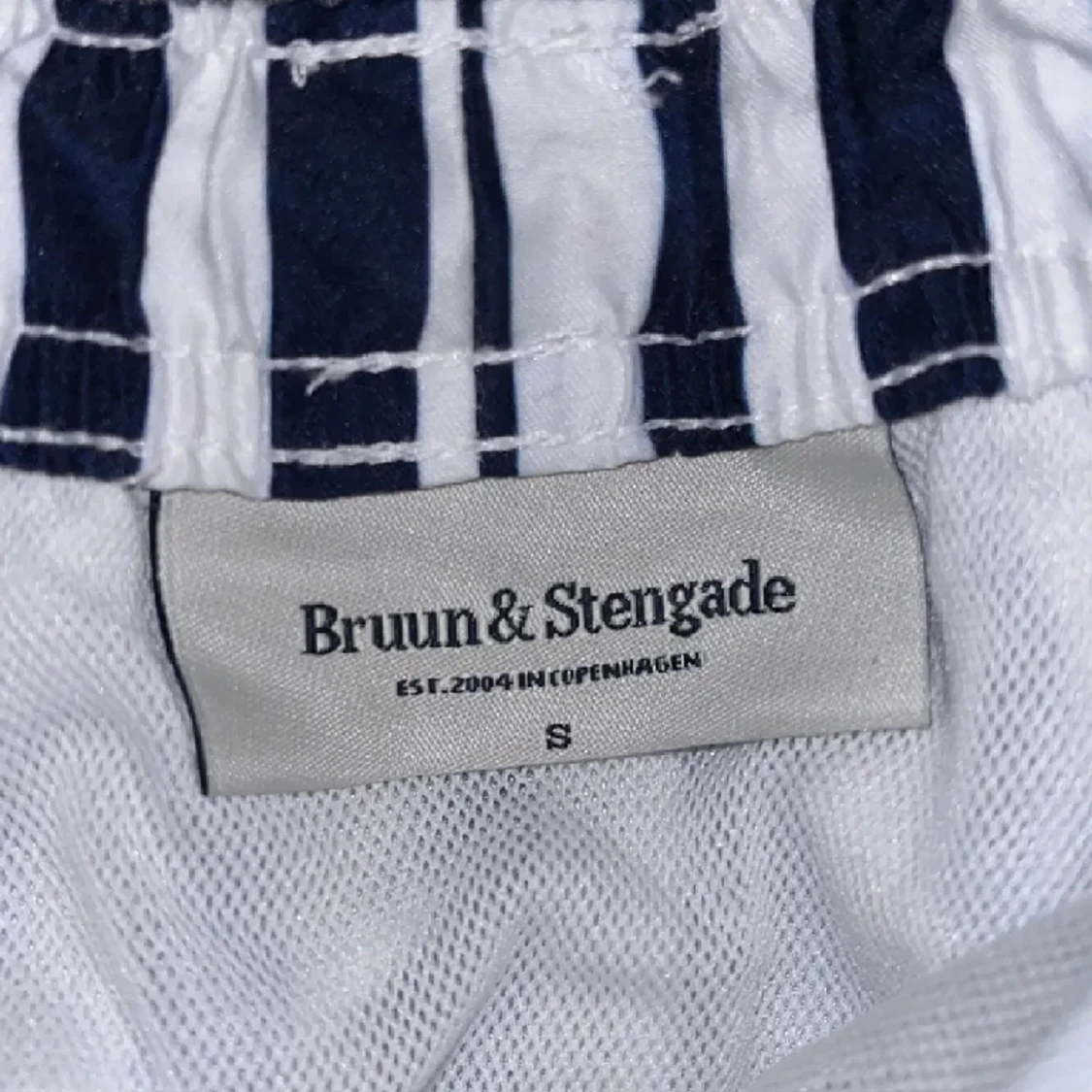 Säljer mina blåvit randiga badbyxor från trendiga märket Bruun & Stengade. De är helt oanvända, köpte under våren och hann bli försmå till sommaren. Storlek S Nypris 400:-