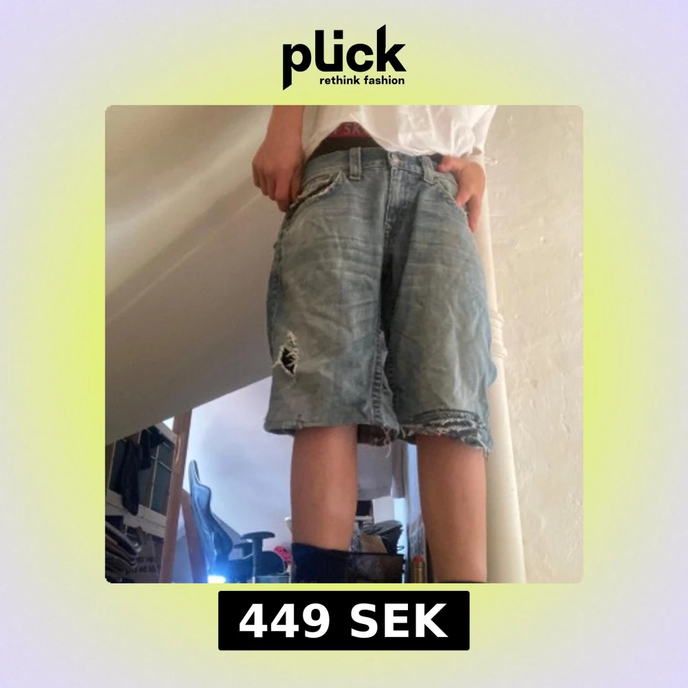 Baggy blå jeansshorts med slitningar och hål på ena benet. Råa, fransiga kanter och klassiska femficksdetaljer. Perfekt för dig som gillar en avslappnad och streetig stil. Längre modell som går ner till knäna. Har sytt dom lite baggy men det syns knappast coola slytningar