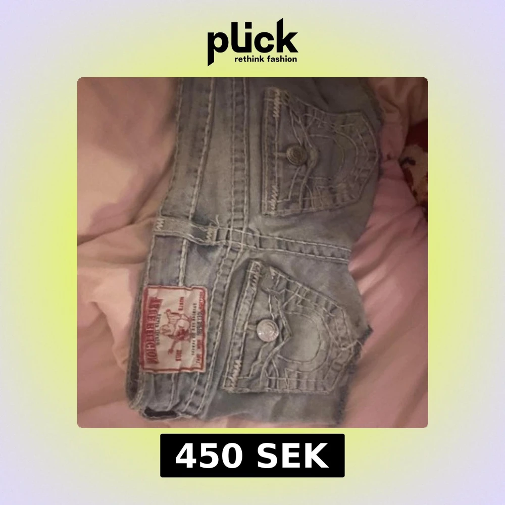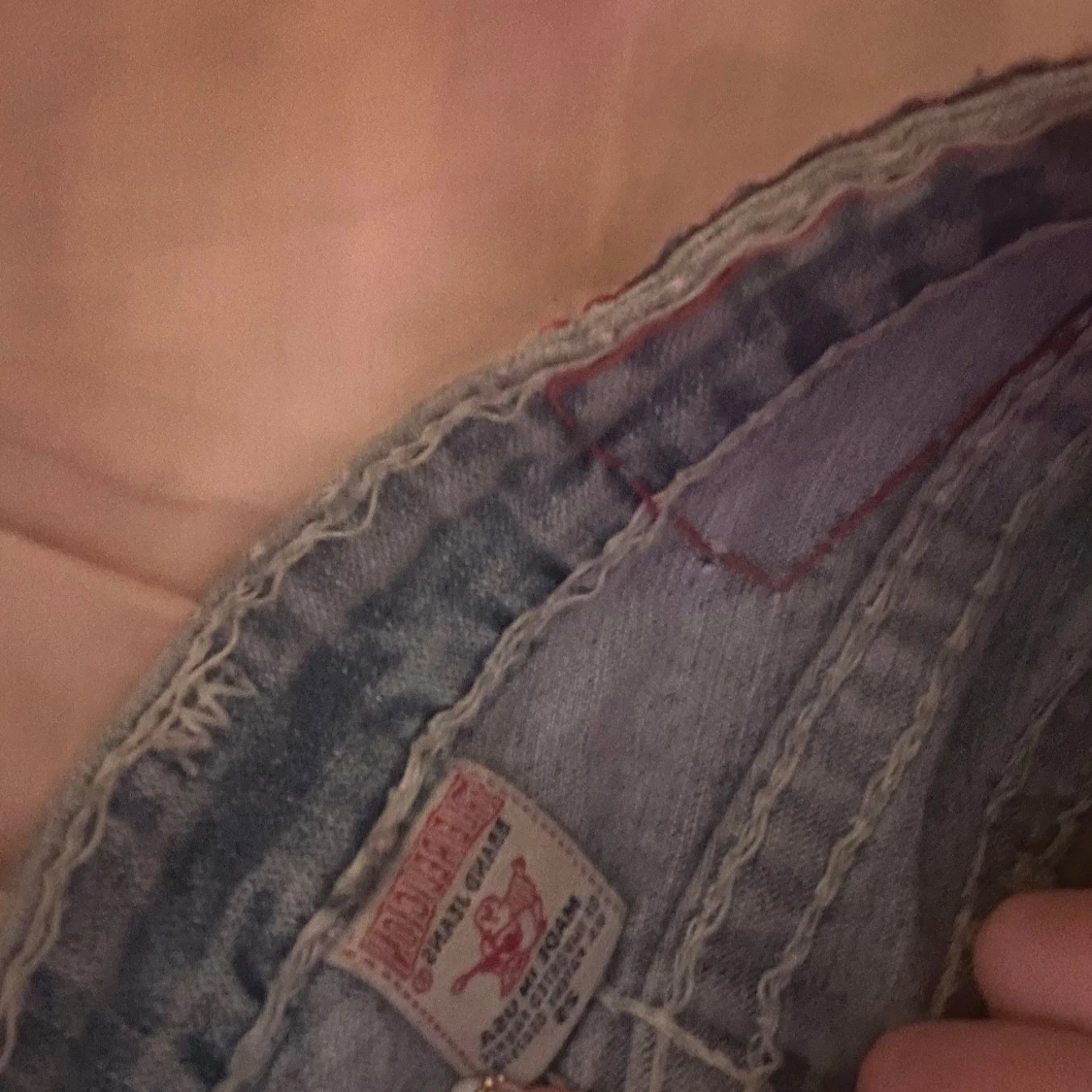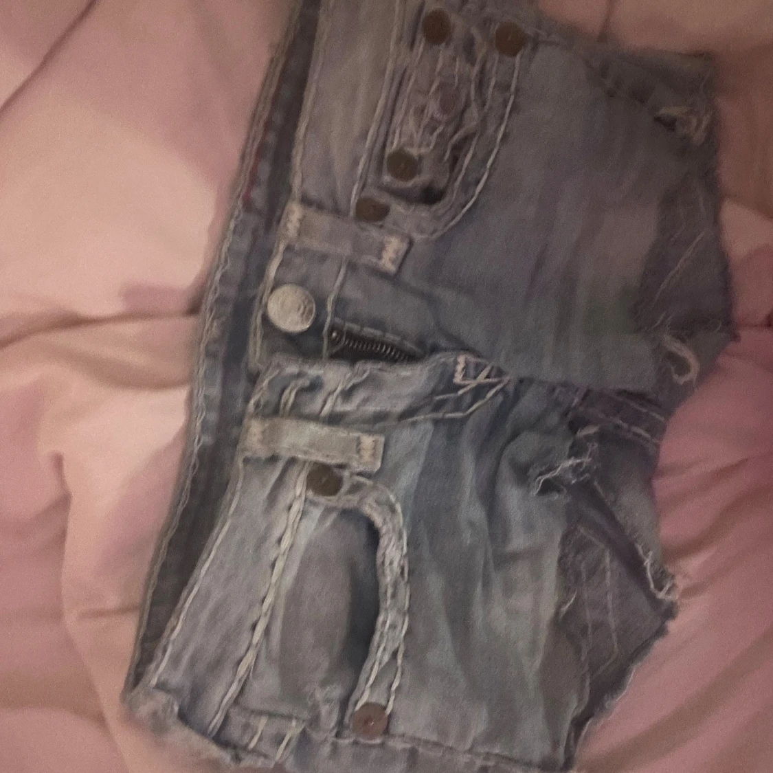Säljer ett par snygga ljusblå jeansshorts från True Religion med ikoniska bakfickor och grova kontrastsömmar. Shortsen har råa kanter, klassisk femficksdesign och silverfärgade knappar.