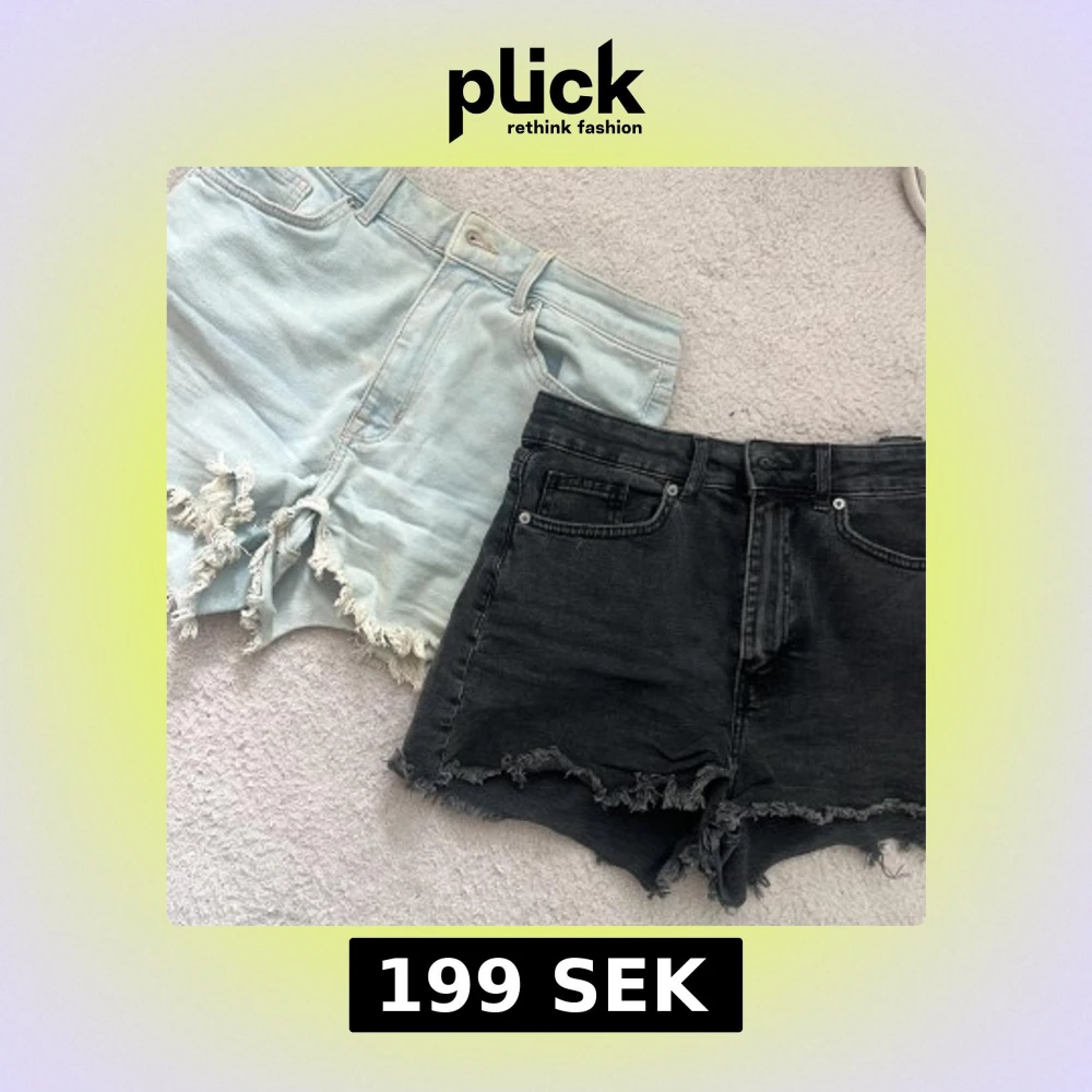 Säljer två par snygga jeansshorts, ett par ljusblå och ett par svarta. Båda har råa, fransiga kanter och klassisk femficksdesign. Perfekta för sommardagar och festivaler. Passar dig som gillar en avslappnad och trendig stil.