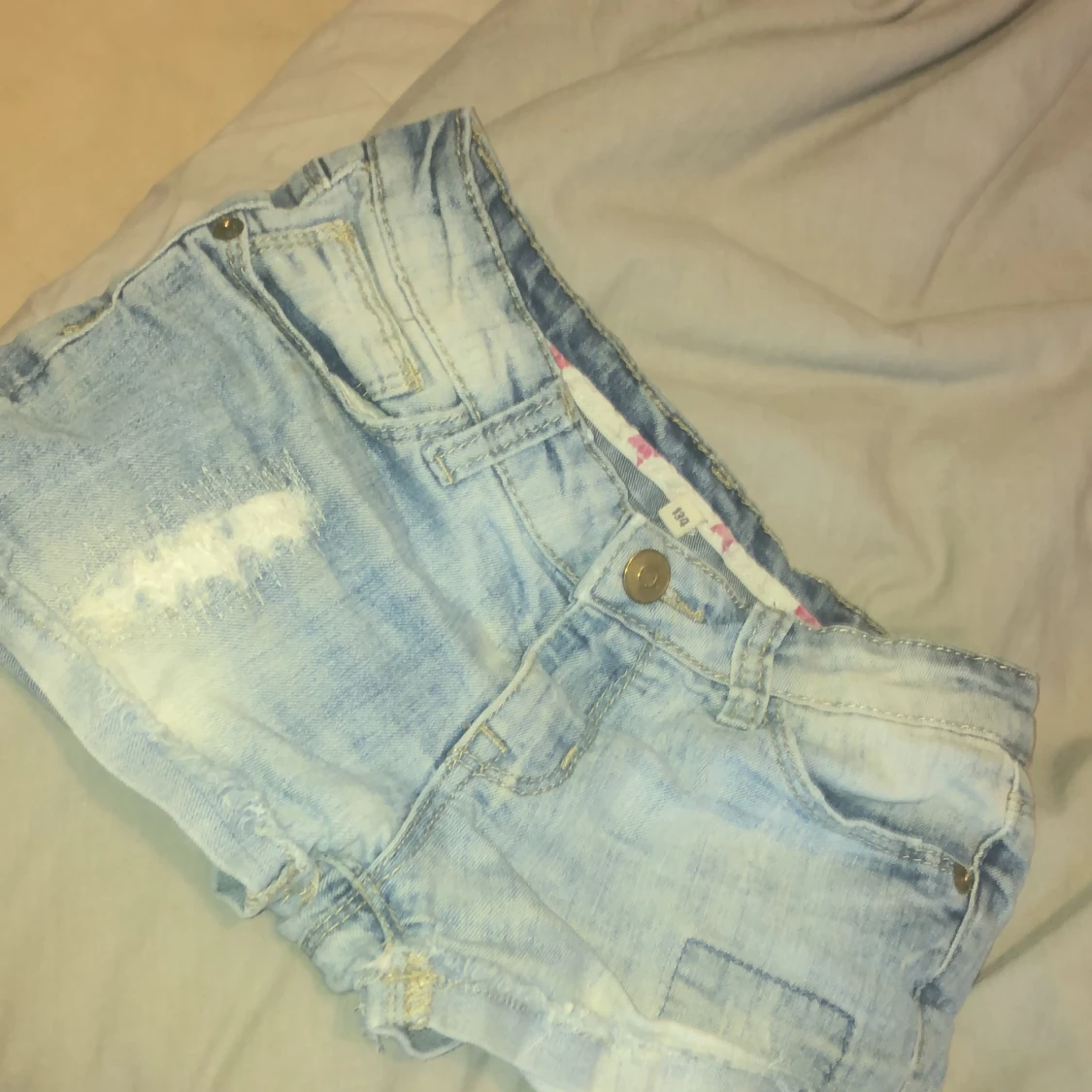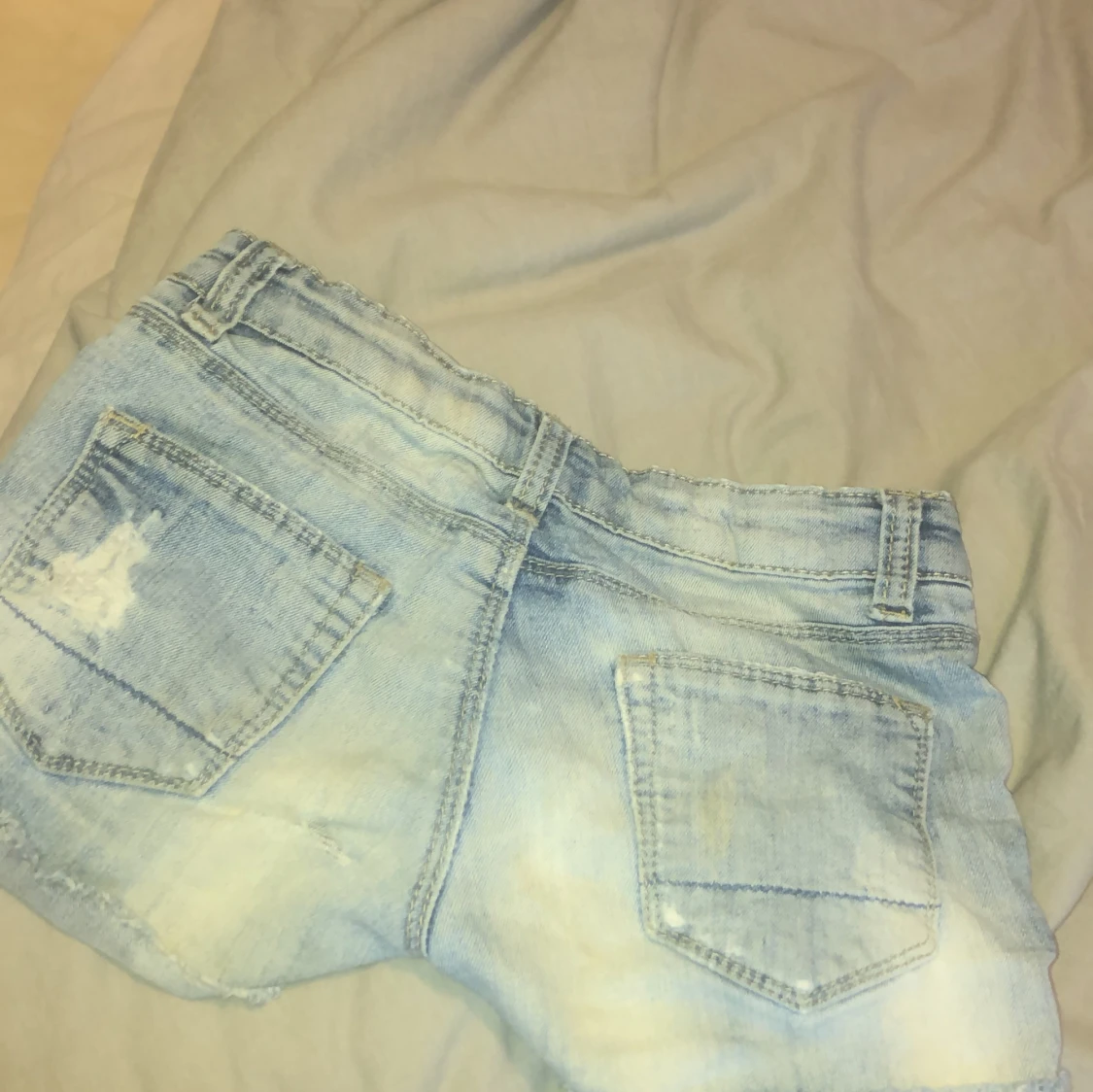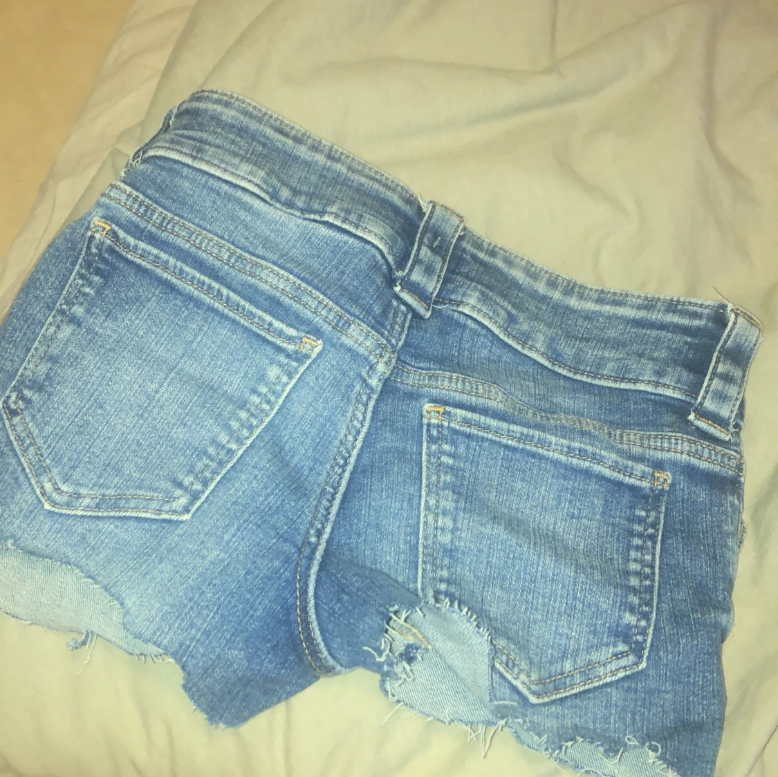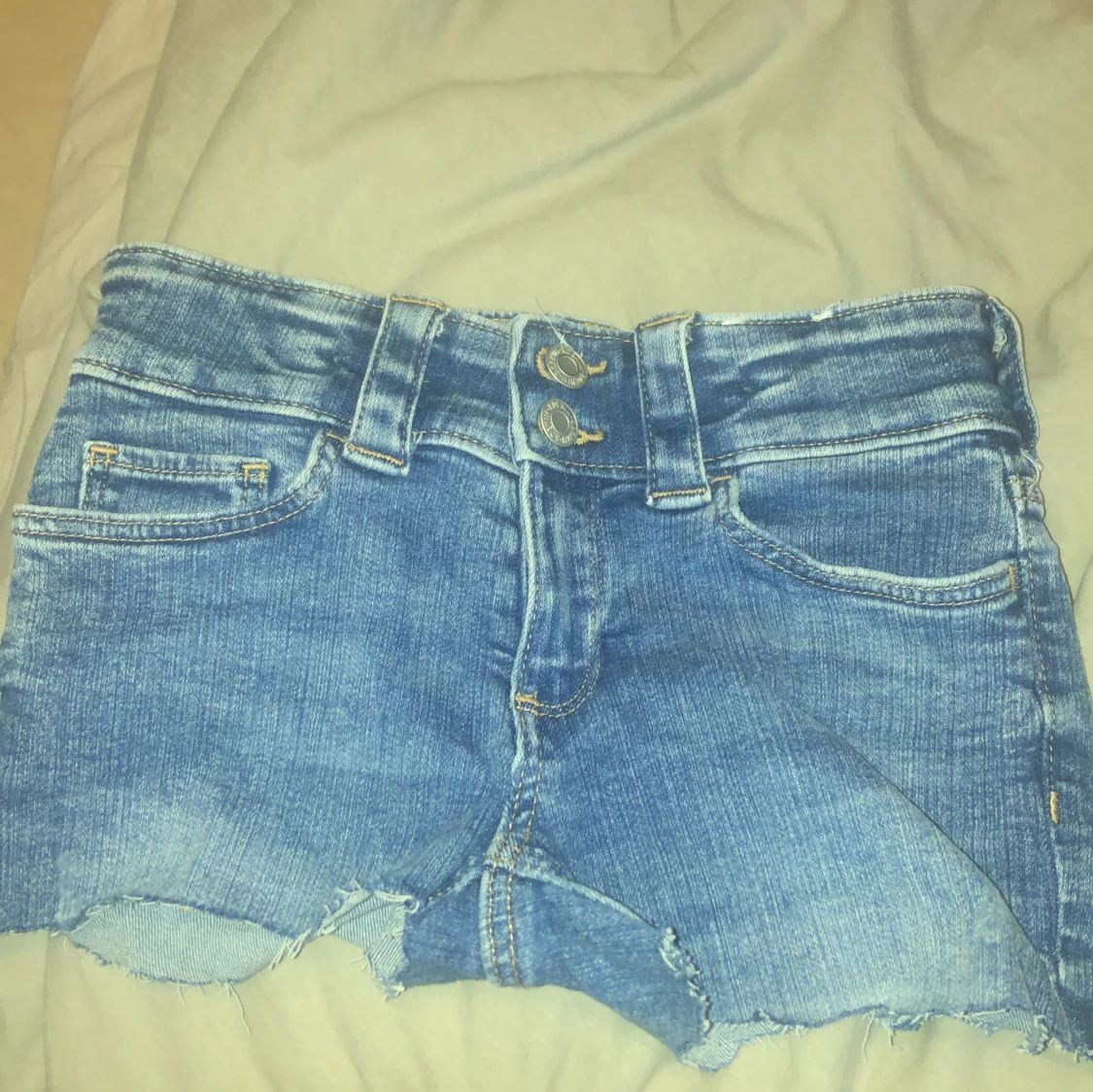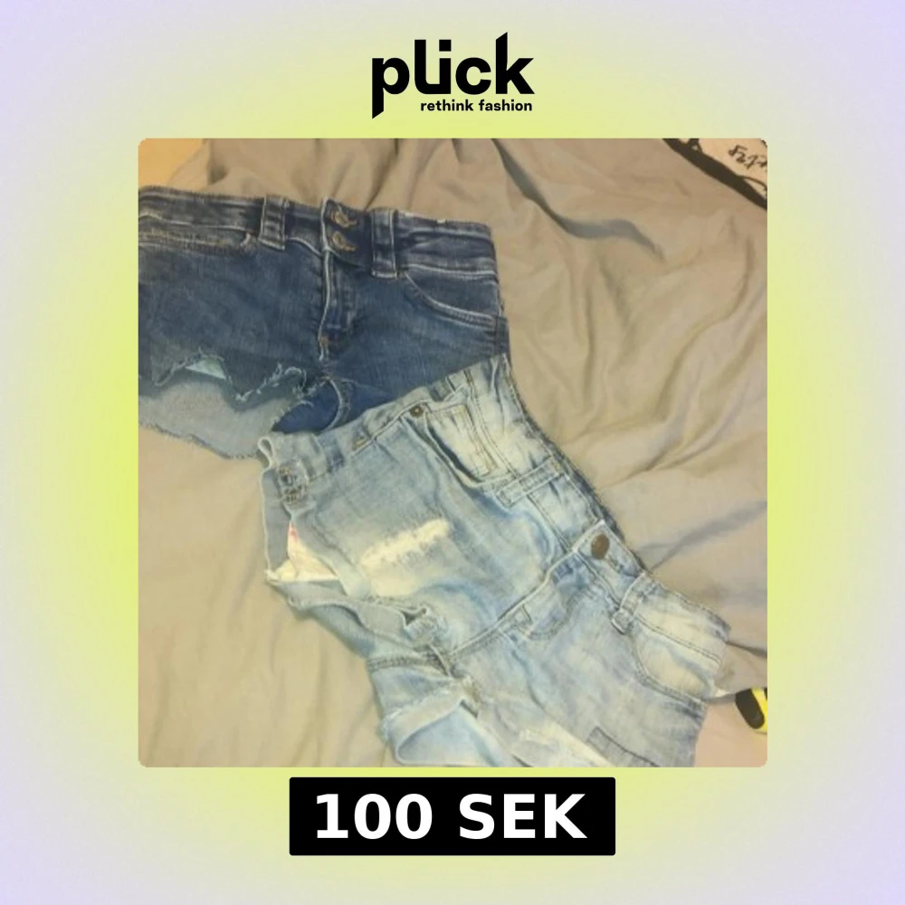 Säljer två par snygga jeansshorts i olika blå nyanser. Ena paret är mörkblå med råa kanter och dubbla knappar fram, medan det andra är ljusblått med slitningar och fransiga detaljer. Båda har klassiska fickor och bälteshällor, perfekta för sommarens chill.