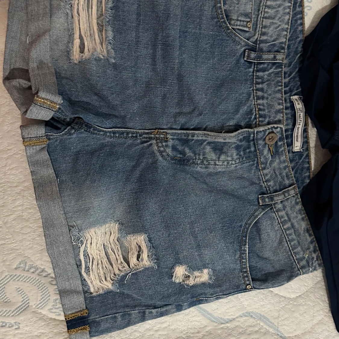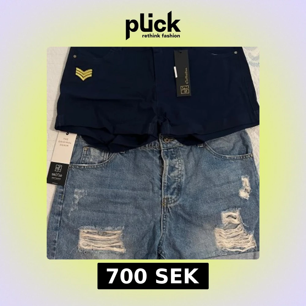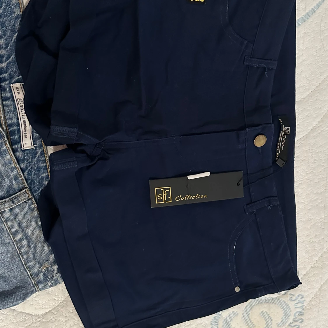 Säljer två par shorts! Ett par klassiska blå jeansshorts från Selfie med slitna detaljer och upprullade benslut. Det andra paret är marinblå från SF Collection, med en gul broderad detalj framtill och stilren design. Perfekta för varma dagar och snygga till sneakers.