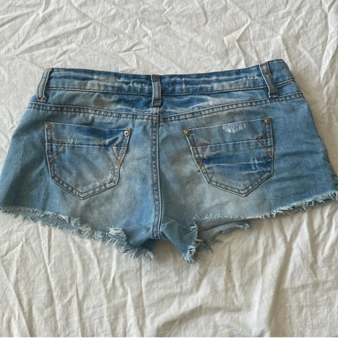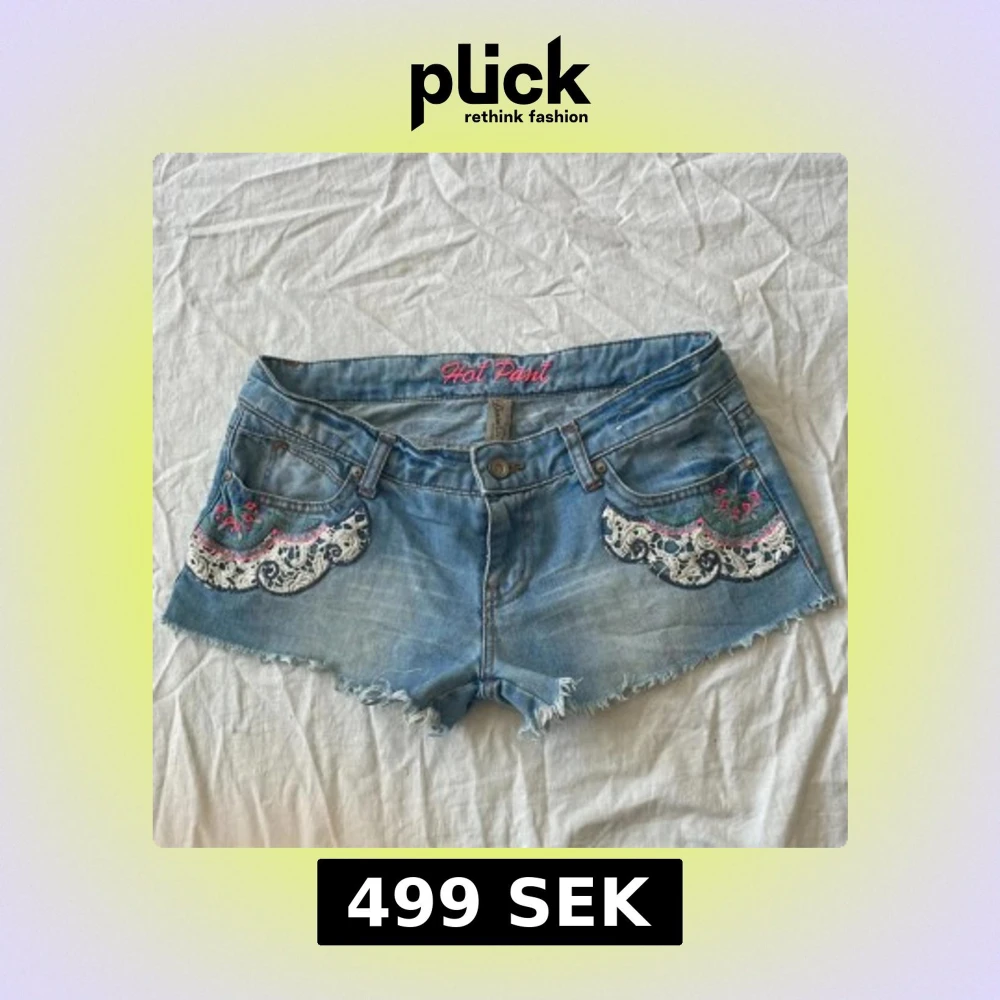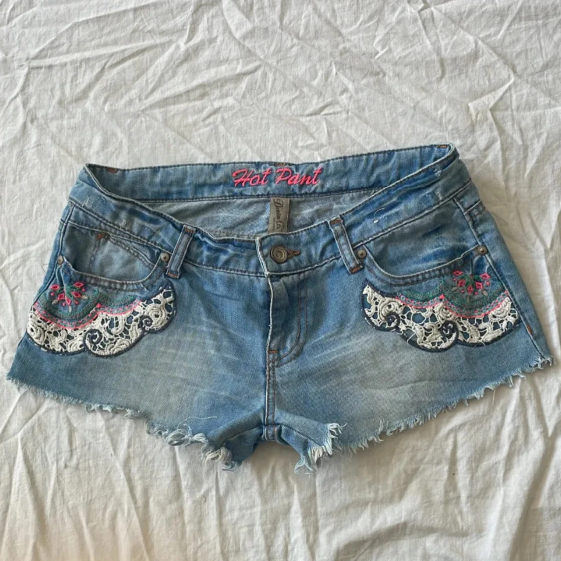 Snygga ljusblå jeansshorts från Hot Pant med råa kanter och broderade detaljer i vitt, rosa och blått på fickorna framtill. Shortsen har låg midja och klassisk femficksdesign. Perfekta för sommarens alla äventyr!