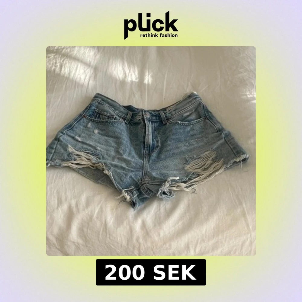 Säljer ett par ljusblå jeansshorts med slitna detaljer och fransar längs kanterna. Klassisk femficksmodell med dragkedja och knapp framtill. Perfekta för varma dagar nu i sommar skriv vid frågor!