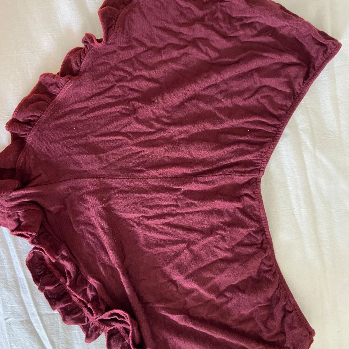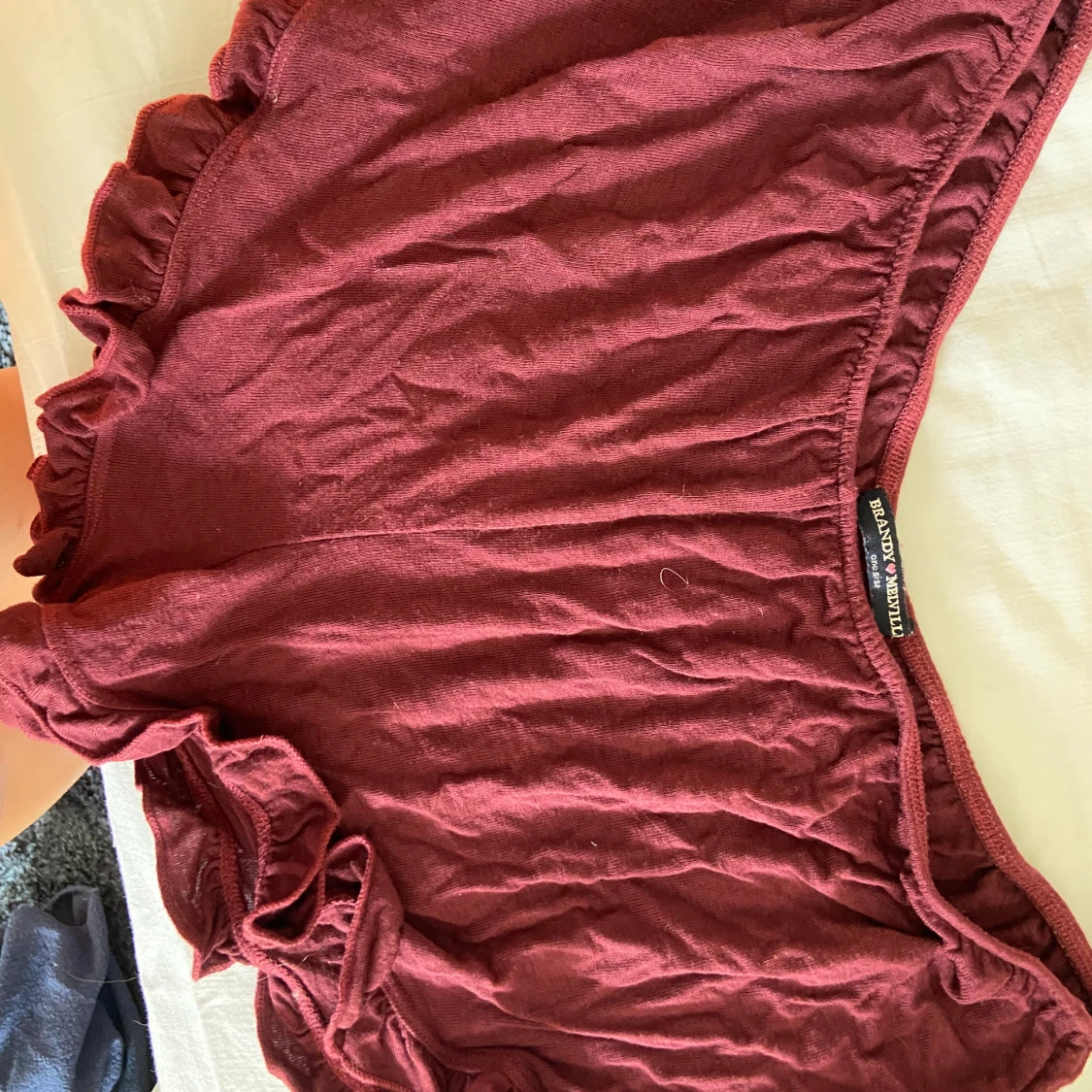 Supersöta vinröda shorts från Brandy Melville med volangdetaljer längs kanterna. De är tillverkade i mjuk bomull och har en loose passform med elastisk midja. Perfekta för sommardagar eller att chilla hemma i.