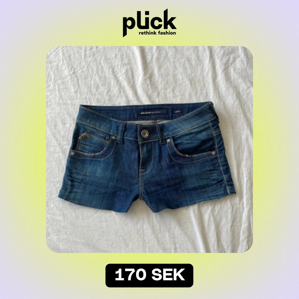 Bra skick! De ser ut att vara klippta till shorts så kan vara lite ojämna längst ner, mått: midjemått rakt över 38,5 grenhöjd 20 längd 24,5cm💗 jag är 176 och brukar ha m