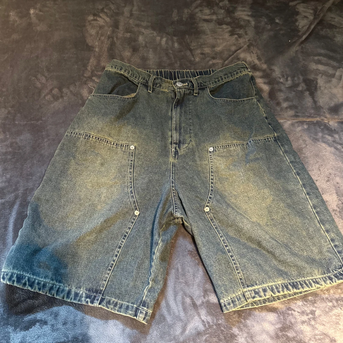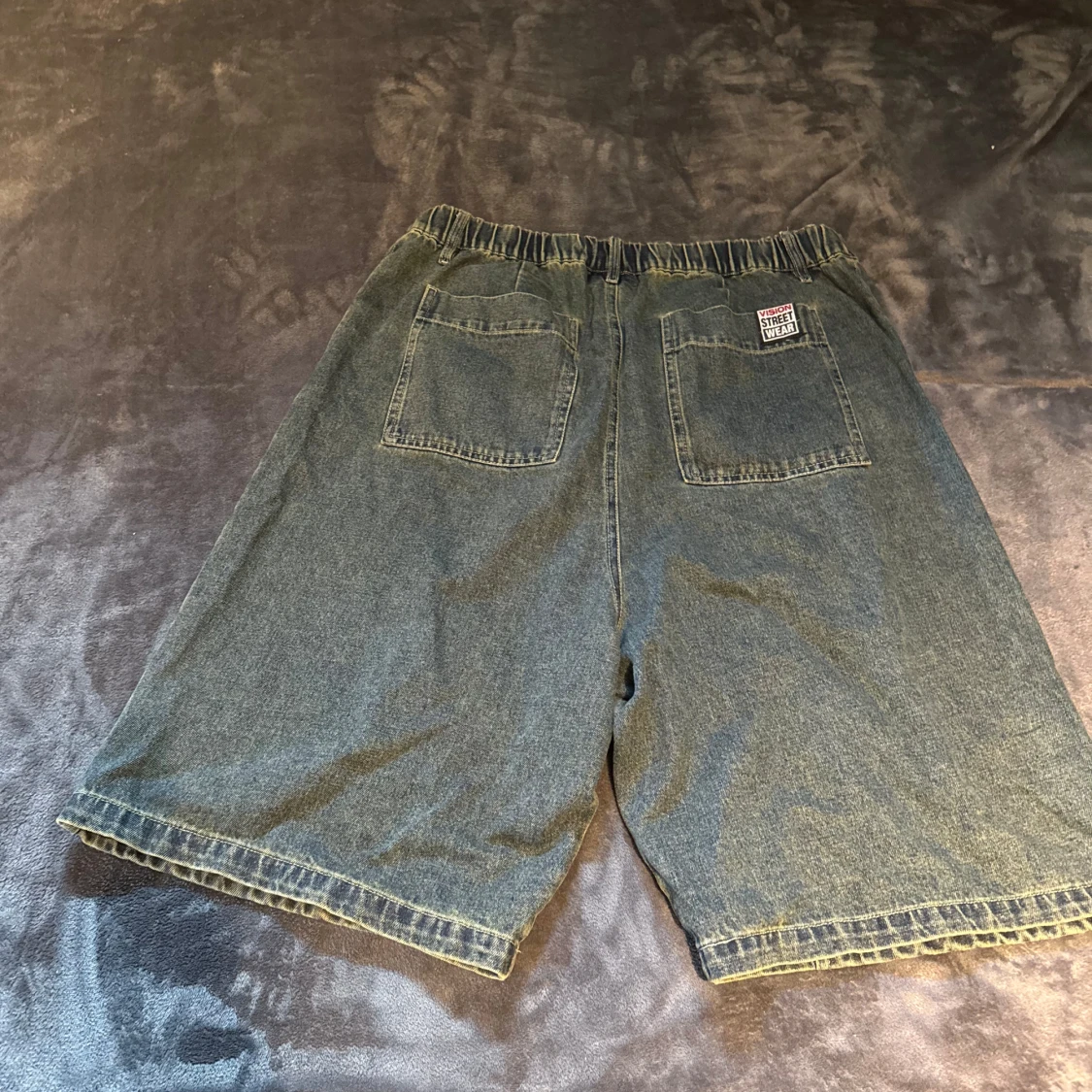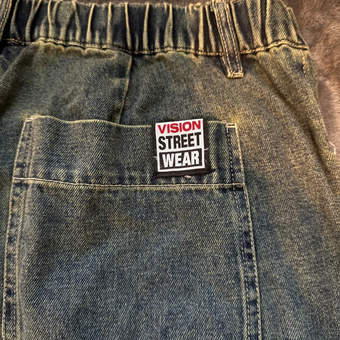 Säljer ett par loose fit jeansshorts från Vision Street Wear i klassisk blå denim. Modellen har elastisk midja, dragkedja och knapp, stora framfickor med nitar och två bakfickor. Perfekt för dig som gillar streetstyle och skater-vibe.